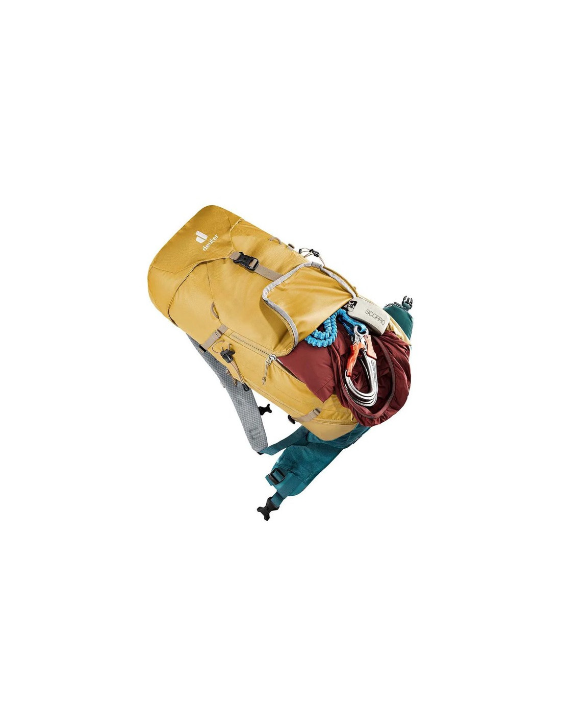 Plochá čepice umožňuje neomezený pohyb hlavy, i s helmou. Navíc má velký přední otvor se zipem a elastickými bočními kapsami, které umožňují rychlý přístup k vybavení. Poutka na ramenních popruhech jsou ideální pro nošení karabiny z via ferrata setu na dosah.