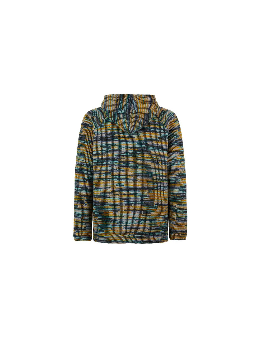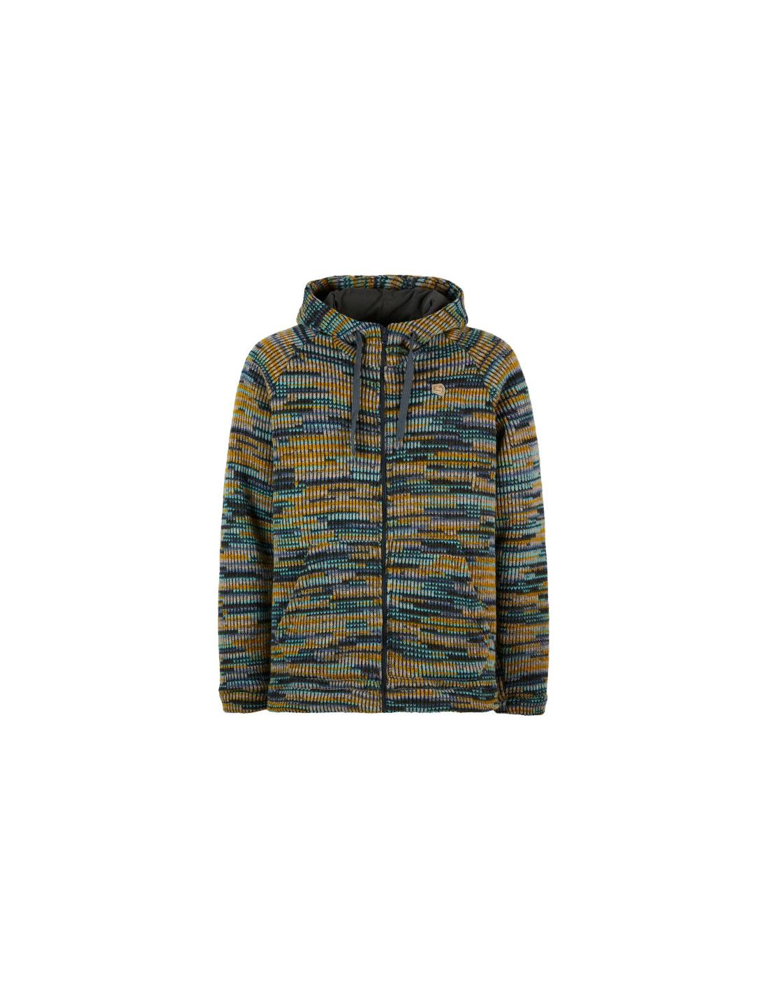 Pletená bunda s nastavitelnou kapucí, dlouhými rukávy a zipem vpředu. Má kapsu vpředu a vnitřní kapsu, stejně jako nášivku na straně srdce. Má běžný střih a je vyroben z 68 % panenské vlny a 32 % polyesteru.