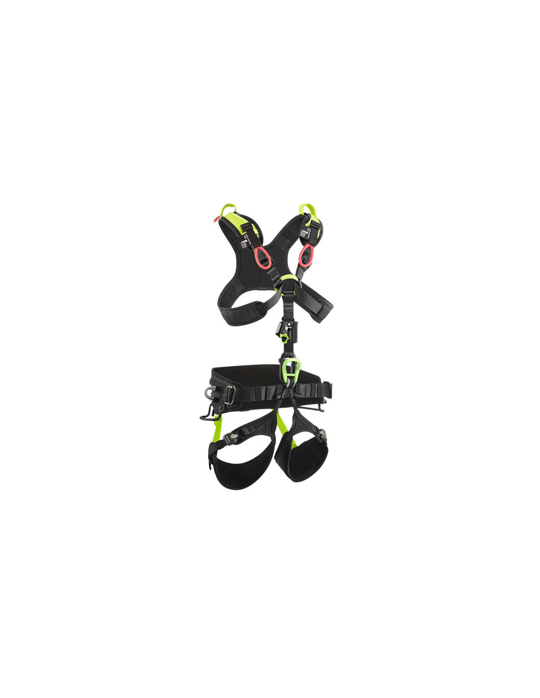 Vertikálně orientovaná boční textilní oka podle EN 358 (obdoba klasických kovových oček) a středová oka podle EN 813 pro upevnění slaňovacího zařízení (maximální hmotnost uživatele: 150 kg).