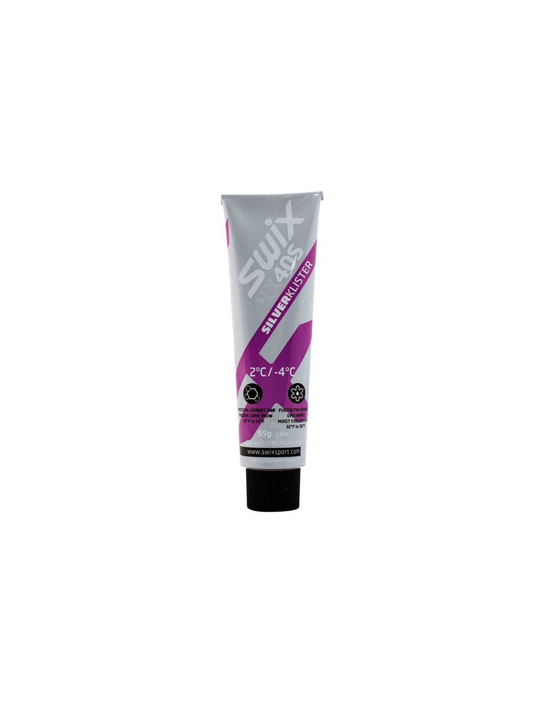 Fialově stříbrný Klister. Teplotní rozsah +2°C až -4°C. Určeno pro zpracovaný a jemnozrnný sníh. Funguje velmi dobře při teplotách nad 0°C a v mírně mokrém jemnozrnném sněhu. Klistr, který proniká hlouběji do suché zóny úchopu bez námrazy. Včetně plastové škrabky.