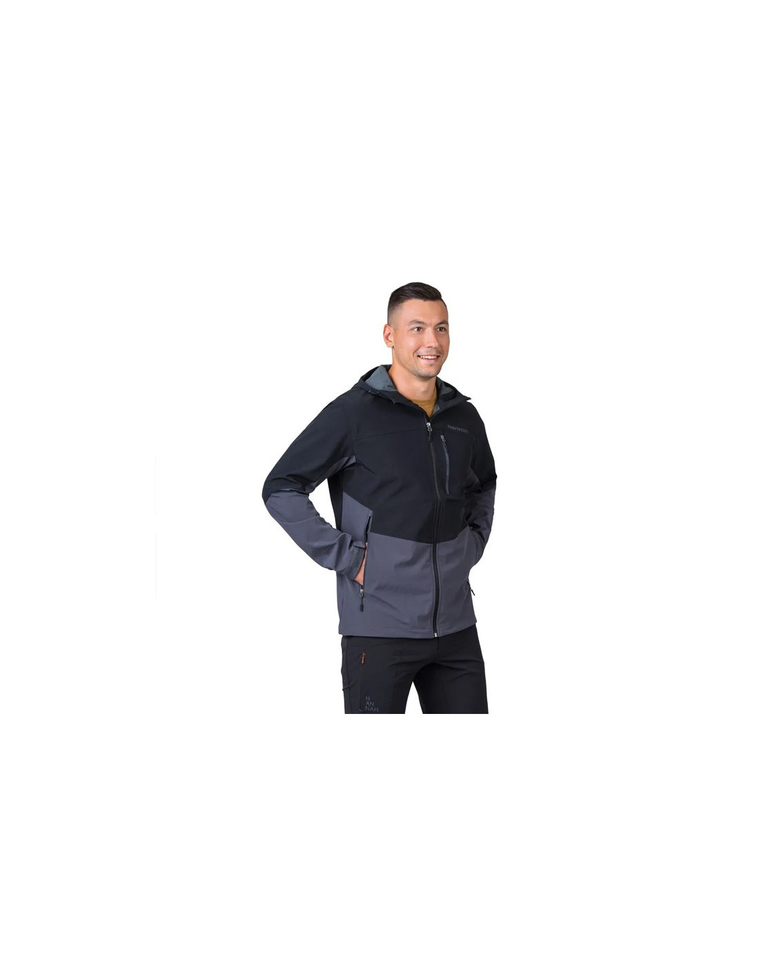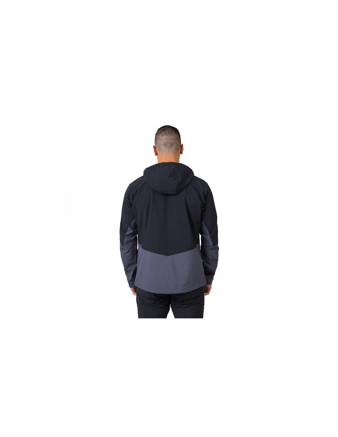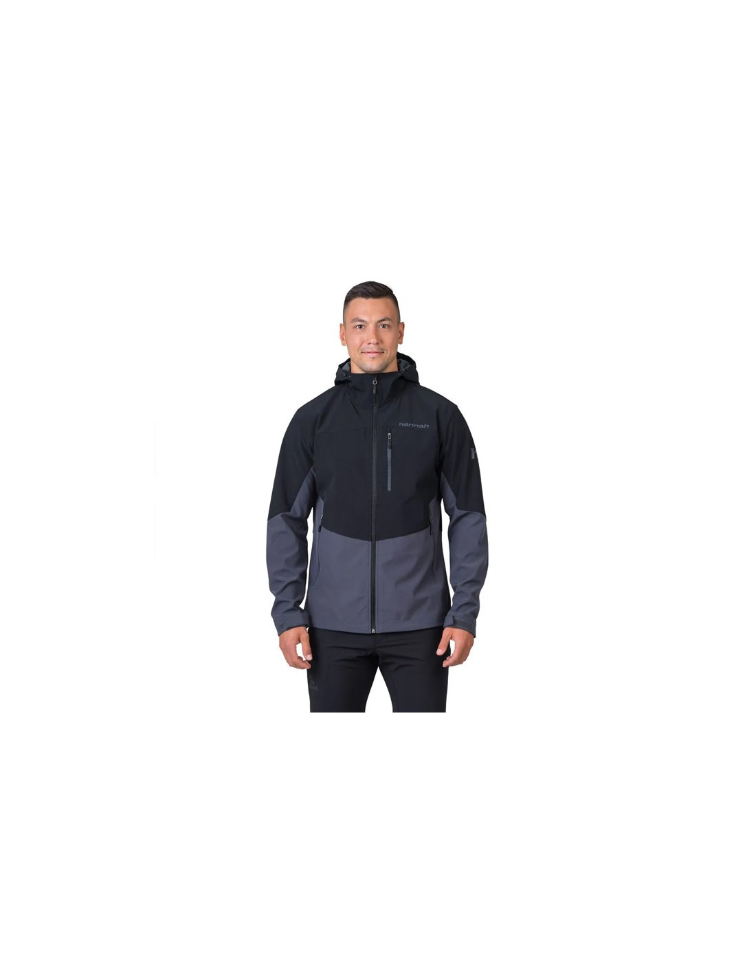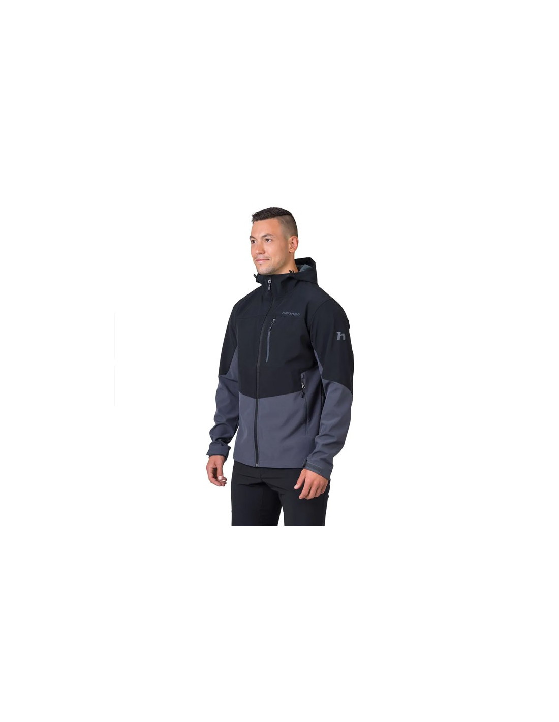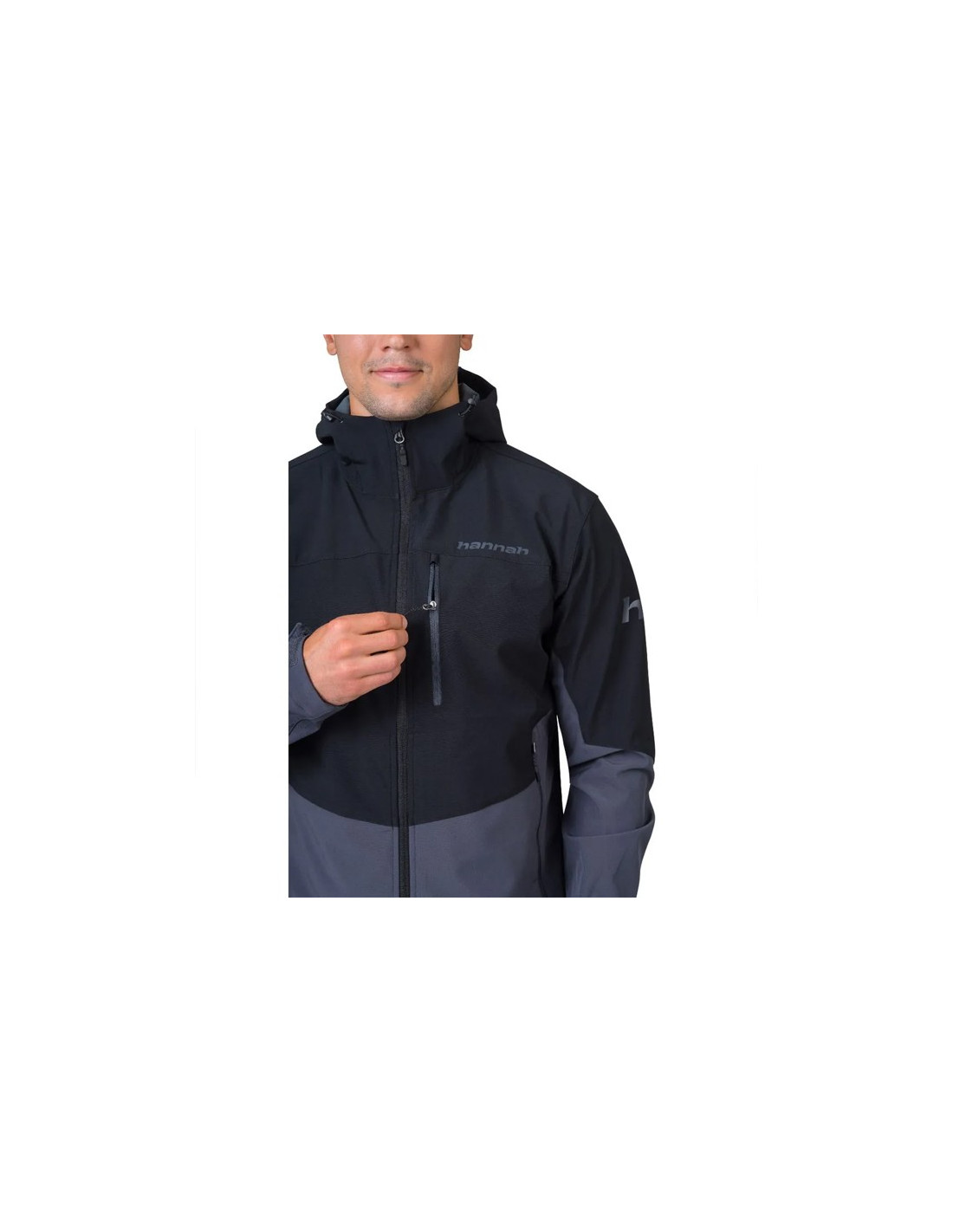 Strækbar, vandafvisende og åndbar softshell-jakke med justerbar hætte, velcro-manchetter og snøre forneden. Ideel til vandreture og udendørs aktiviteter.