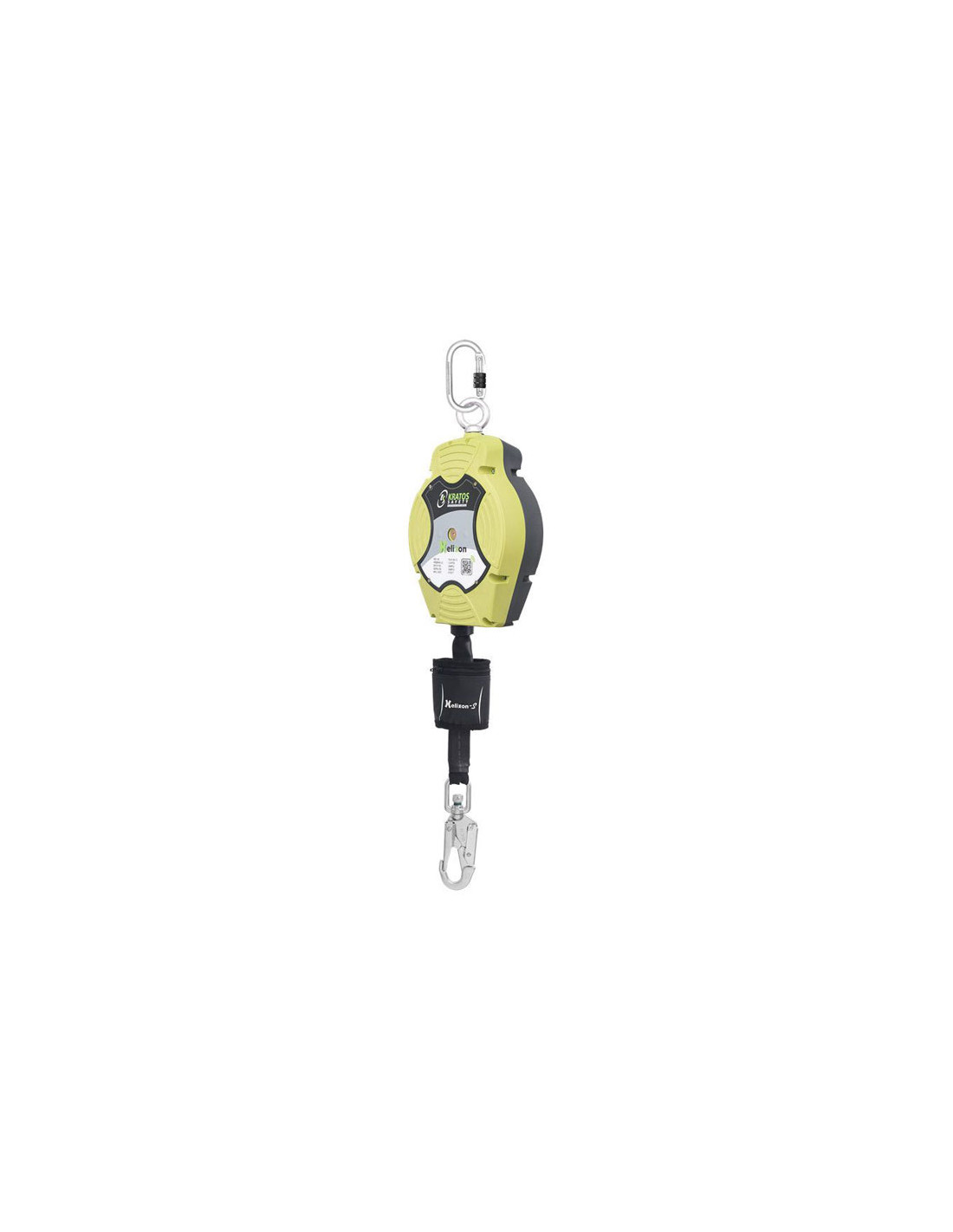 - Stålkarabinhage med gevindlås og 17 mm åbning for tilslutning til ankerpunktet. Denne karabinhage roterer 360° takket være den roterende krumtaphusring.
