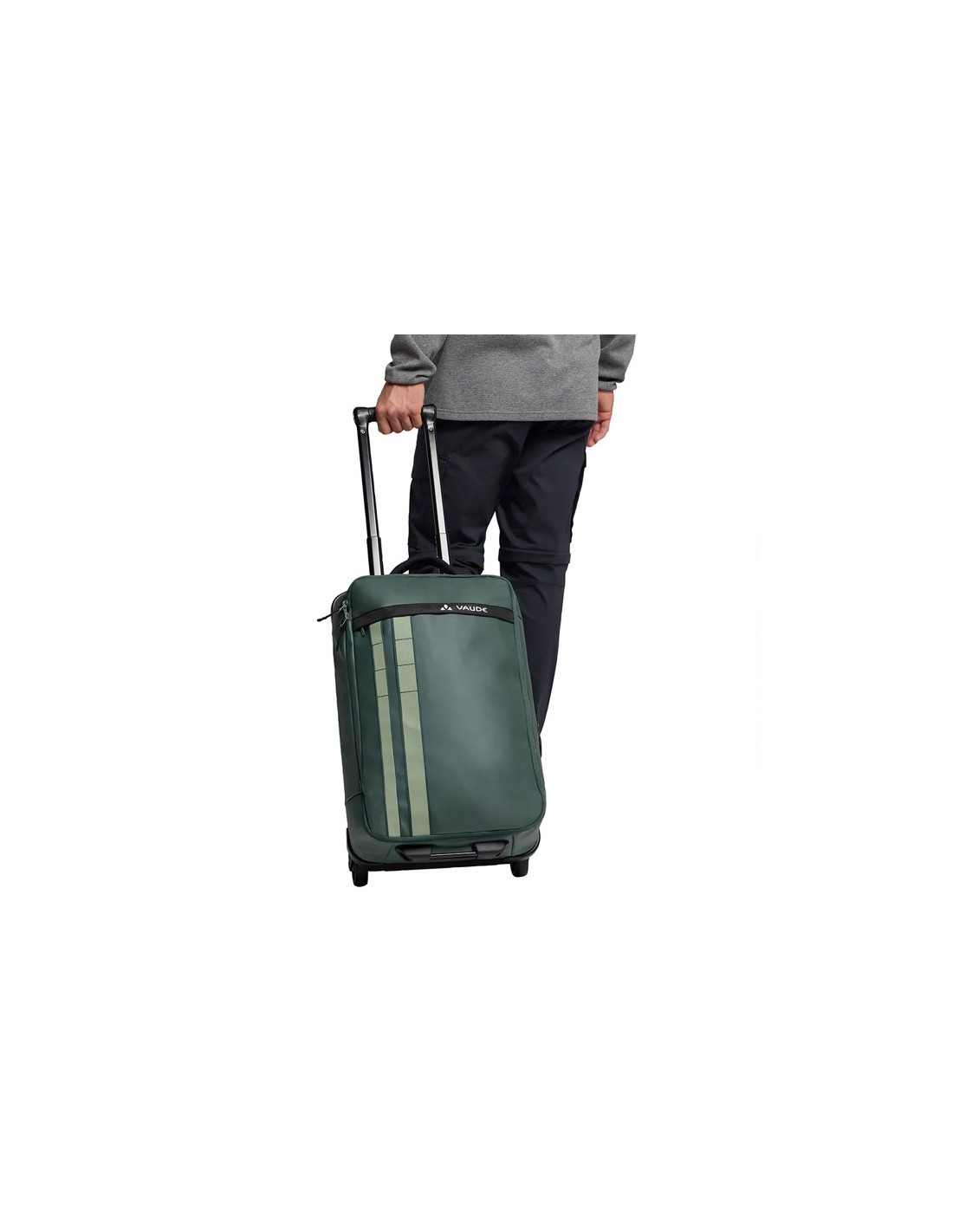 Den har polstrede håndtag på de korte og lange sider for komfortabel transport i forskellige positioner. Derudover har den lydløse gummihjul og et udtrækkeligt teleskophåndtag for nem bevægelse over lange afstande. De to reflekterende VAUDE-striber på fronten og de praktiske kroge på toppen tilføjer funktionalitet og sikkerhed.