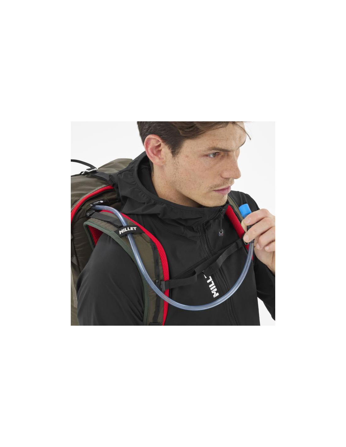Før vi starter opstigningen, tager vi beskyttelsesjakken ud gennem sideåbningen lynlås og en kornstang fra forlommen. Funktionaliteten af denne bjergbestigningsrygsæk er værdsat, hvilket endda giver os mulighed for at integrere en hydreringspose. Med den rullede åbning og de to øverste håndtag får vi hurtigt og nemt adgang til indholdet.
