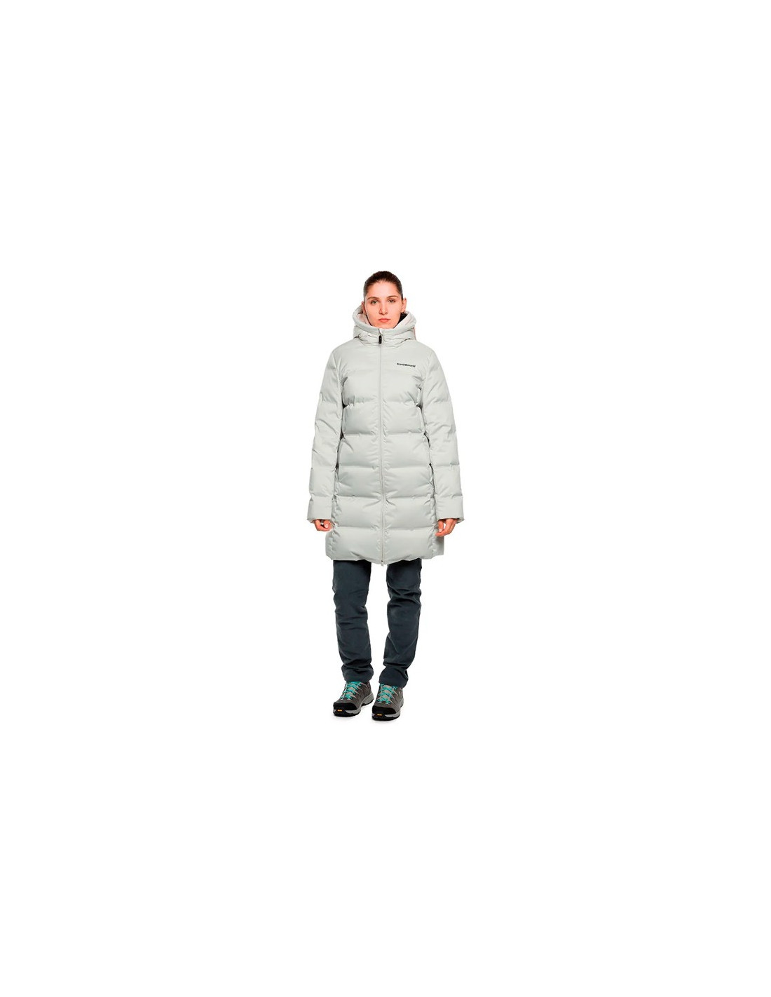 Den har en fast hætte med en ansigtskontursnøre for en optimal pasform, langsgående lynlås med dobbelt skyder og manchetter justeret med elastik for at forhindre kulde i at trænge ind.