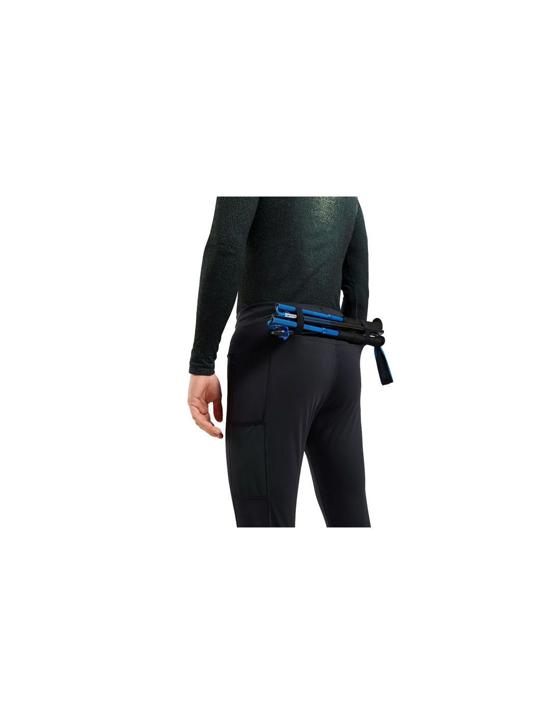 Taljebåndet indeholder elastiske mesh-lommer og en udvendig træksnor, der muliggør en præcis og behagelig pasform. Derudover har den netlommer på lårene, hvoraf en har en ekstra sikkerhedslomme med lynlås til opbevaring af værdigenstande. Remme med silikoneindlæg er blevet tilføjet bagpå for at bære stængerne sikkert.