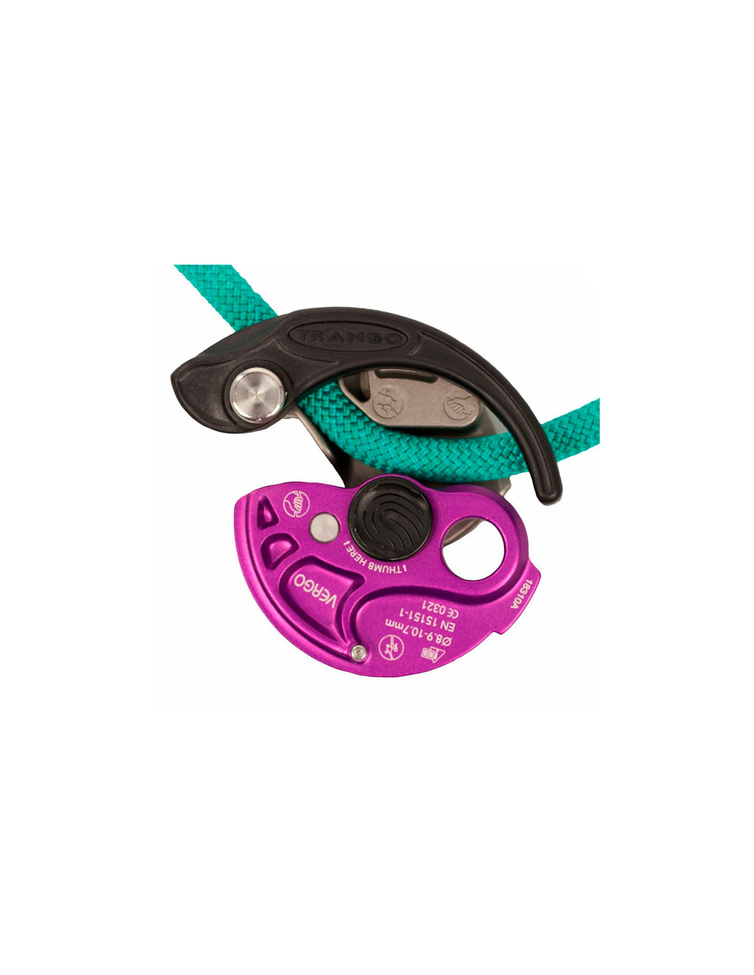 Simpel rebsikringsanordning fra mærket Trango til sportsklatring, en kompakt og ergonomisk model, der er nem at bruge.