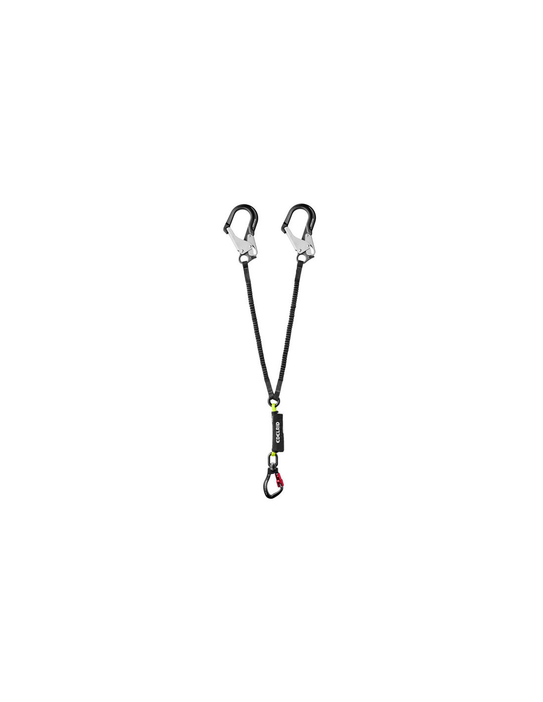 Y-shaped lanyard with elastic arms from the Edelrid brand, integrated shock absorber and large aluminum carabiners on the palm.