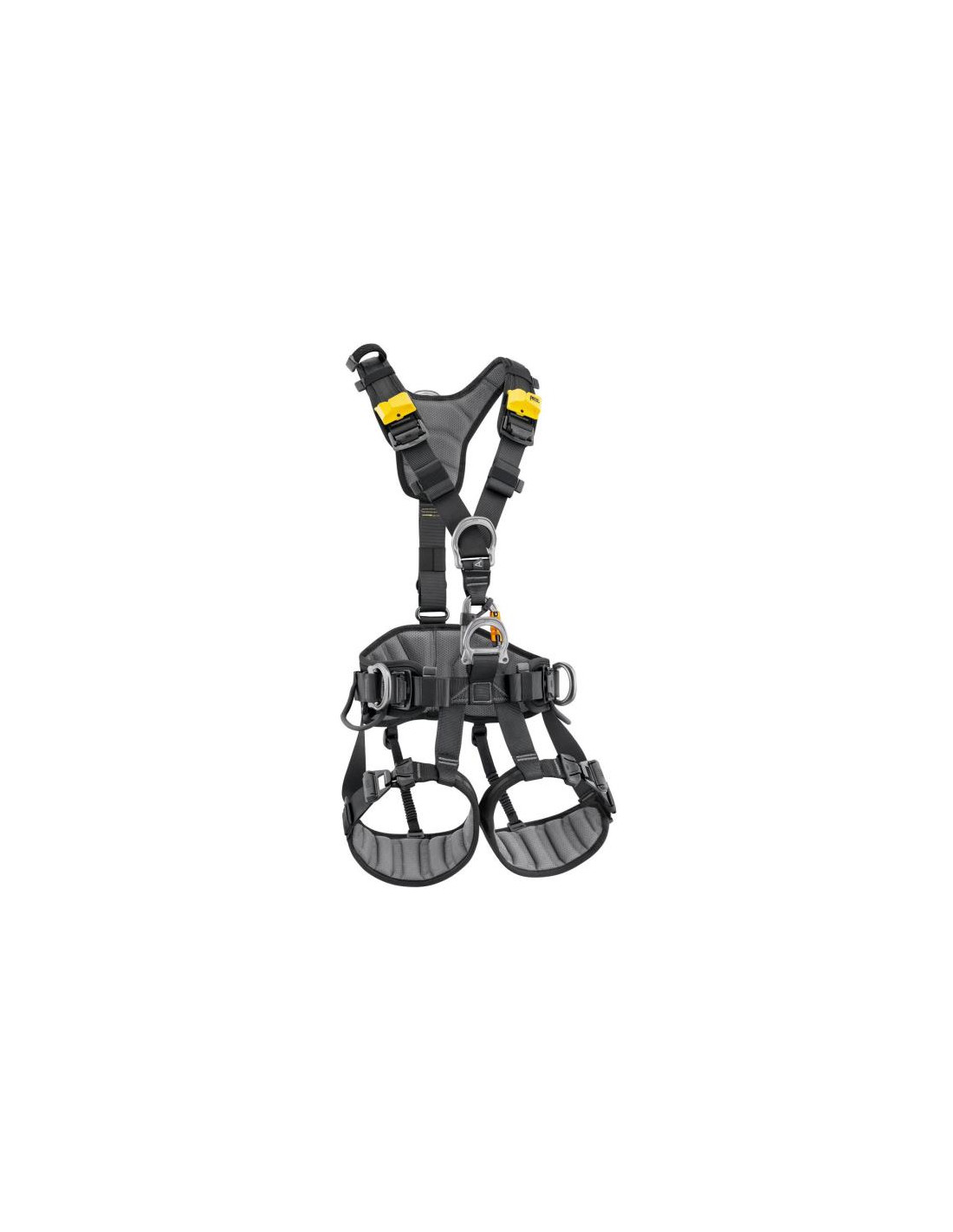 • Todas las zonas de contacto, tirantes, cinturón y perneras, con espuma preformada y acolchada de tejido transpirable, permiten al usuario evolucionar y trabajar confortablemente.
