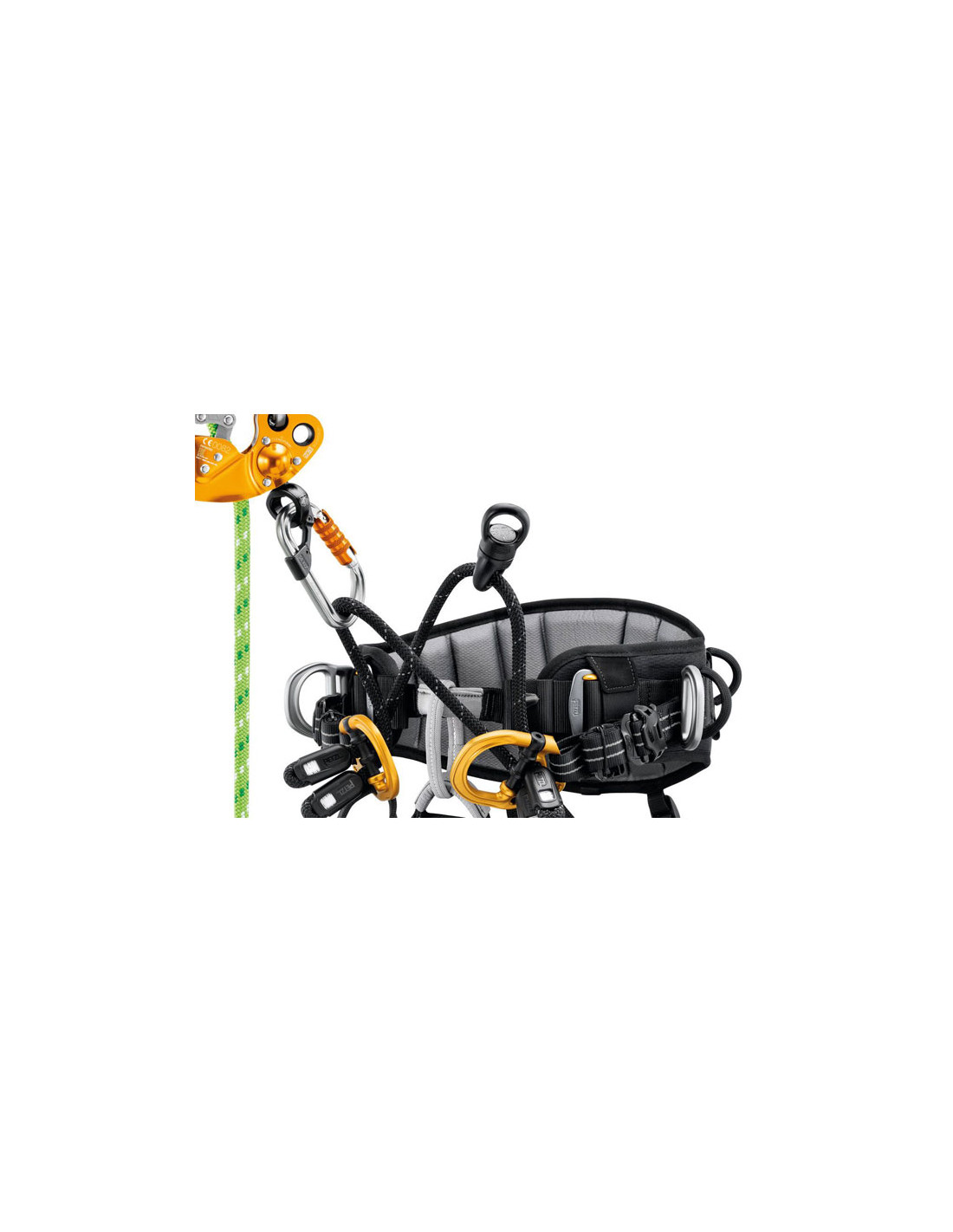 - Punto de enganche ventral para usar Prusik mecánico Zigzag o Zigzag Plus con los accesorios Chicane y Knee Ascent para ascender por una sola cuerda.