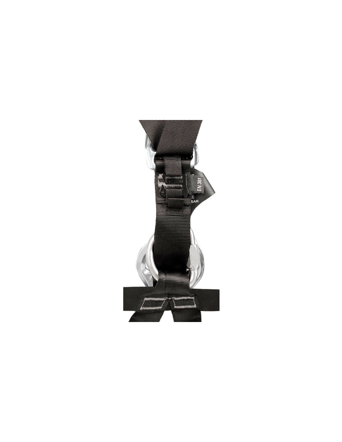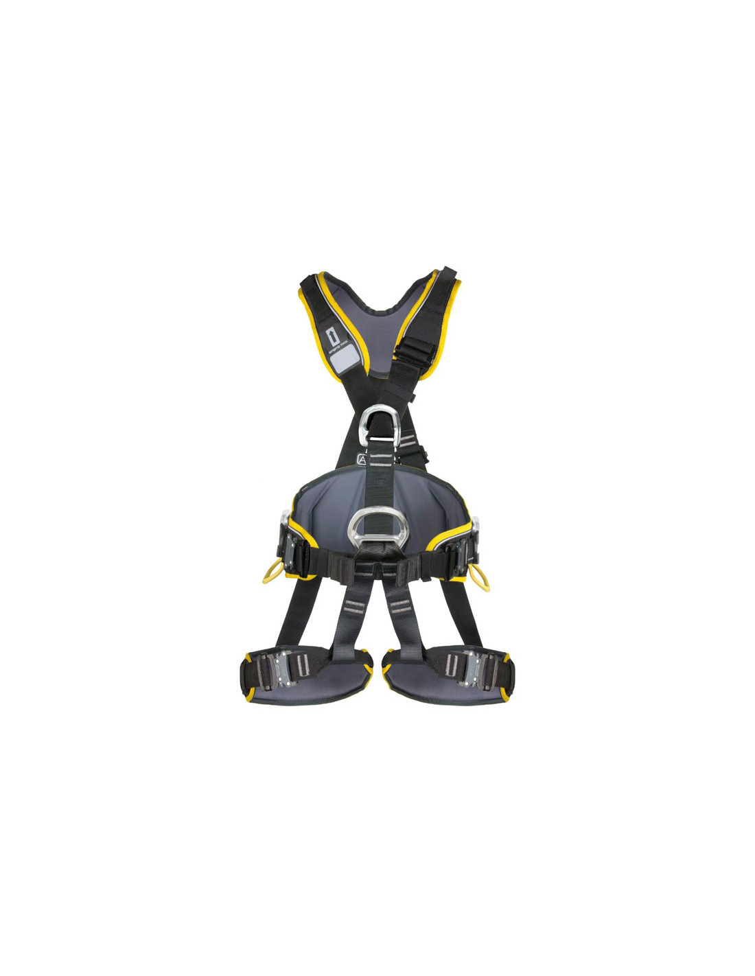 - Puntos de anclaje dorsal y esternal para detención de caídas (EN 361) con marcado adicional "A". EL punto dorsal es plano para no molestar cuando se lleva una mochila o un aparato de respiración.