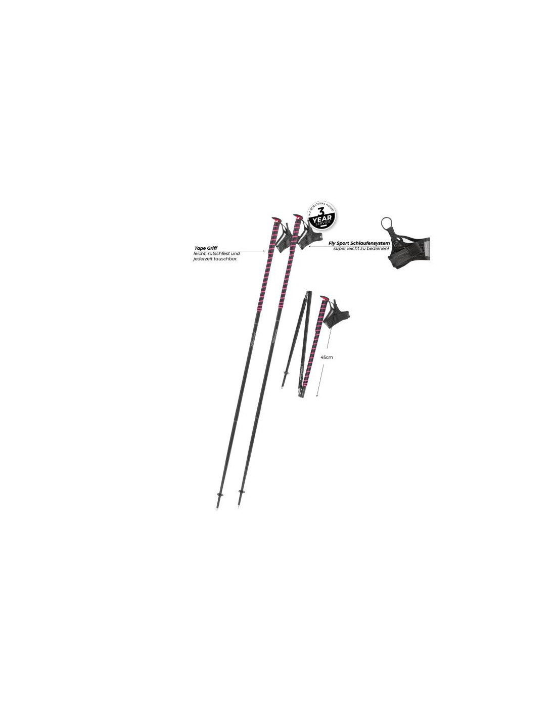 ¡Adorna tu bastón con cintas intercambiables! Un revestimiento especial antideslizante proporciona un agarre superior. El nuevo sistema de dragonera Fly superligero es rápido y fácil de usar: simplemente se engancha y listo. Listo para usar de inmediato gracias al mecanismo FXP autodesplegable.