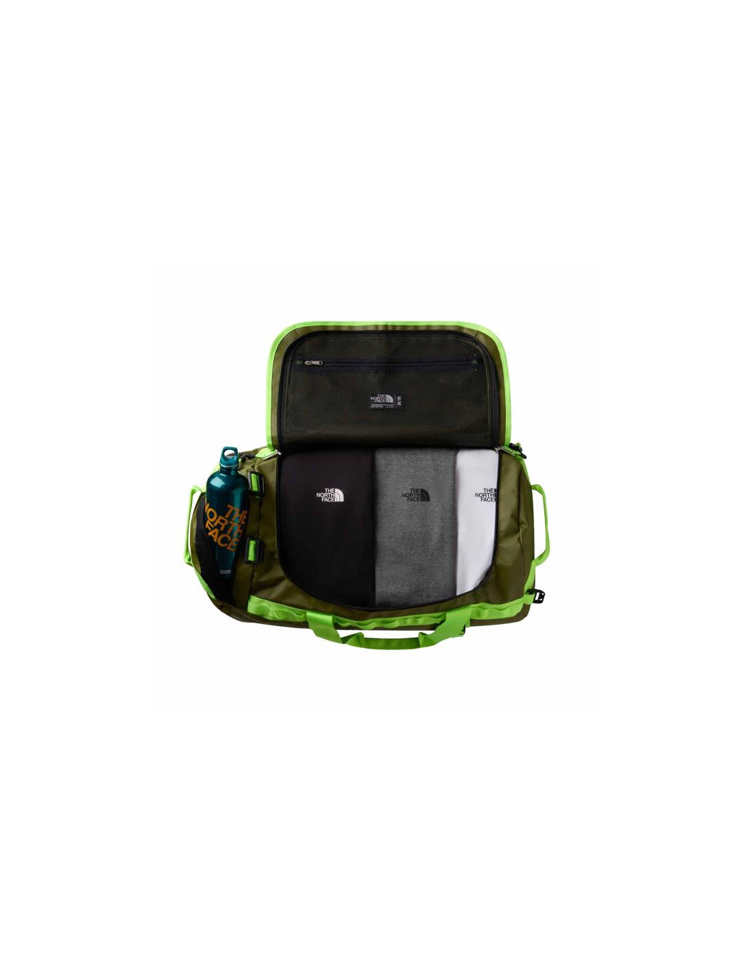 Bolsa de transporte, tanto de material como de textil de la marca The North Face, fabricada con un material altamente resistente e impermeable.