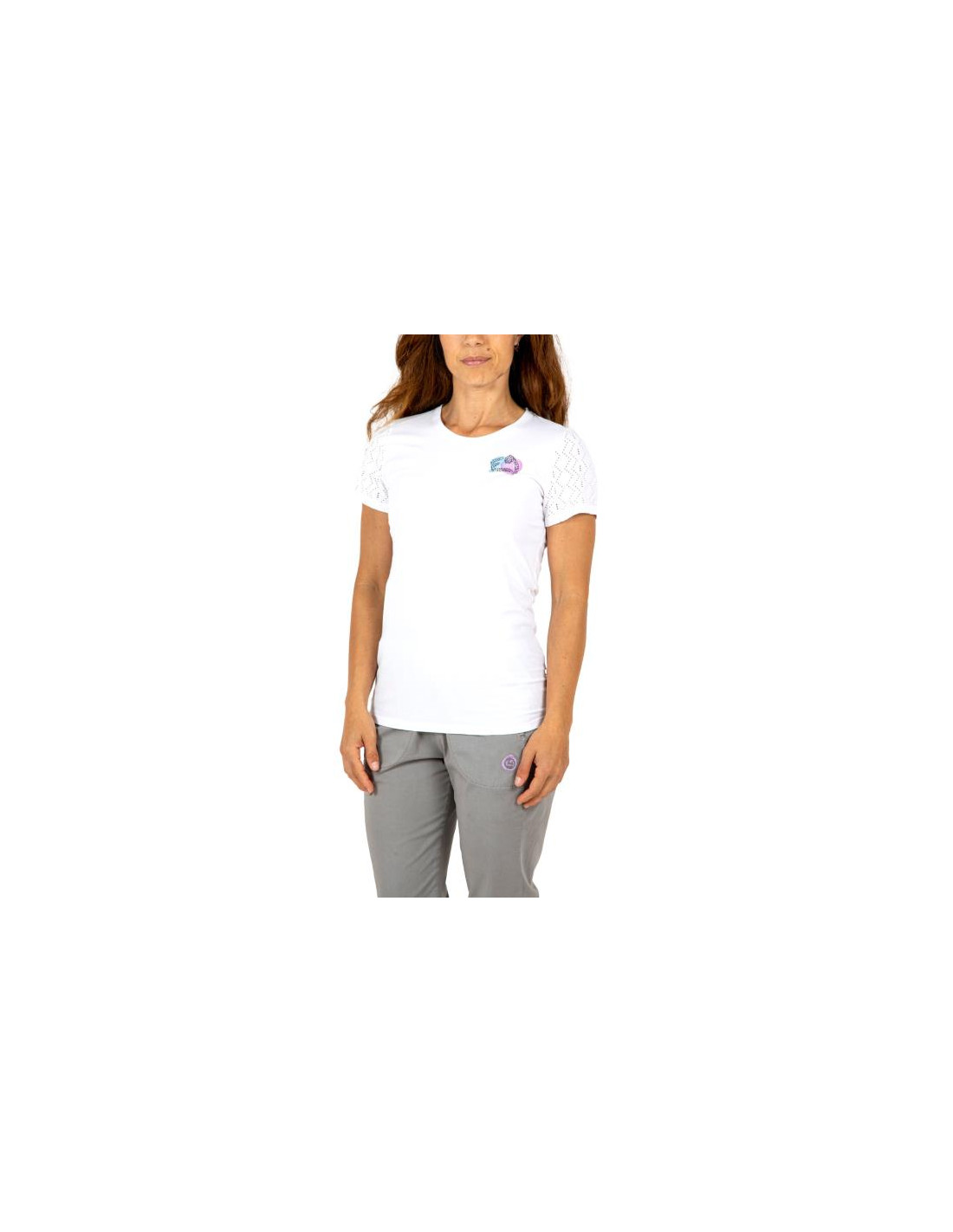 Camiseta elástica y cómoda de manga corta de la marca E9 para mujer, un modelo de patrón ajustado confeccionado en tejido de algodón.