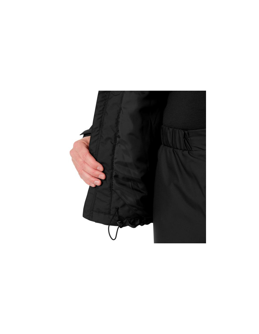- Dobladillo ajustable con cordón elástico dentro del bolsillo para las manos