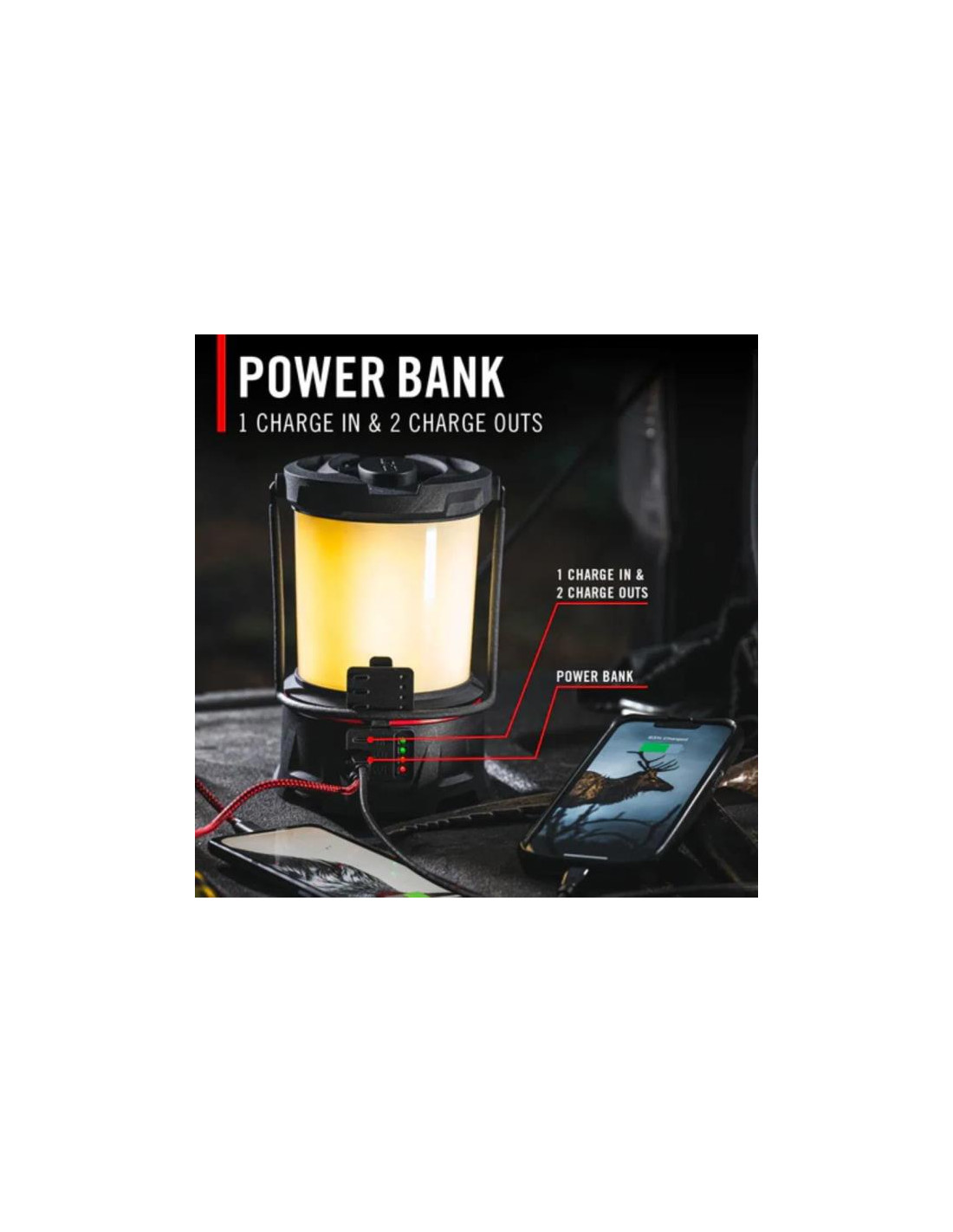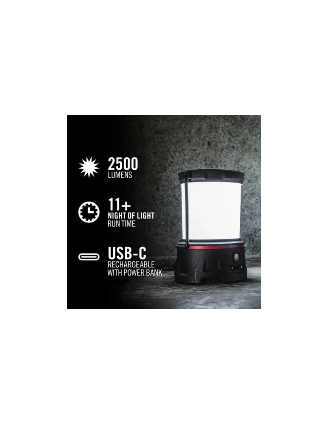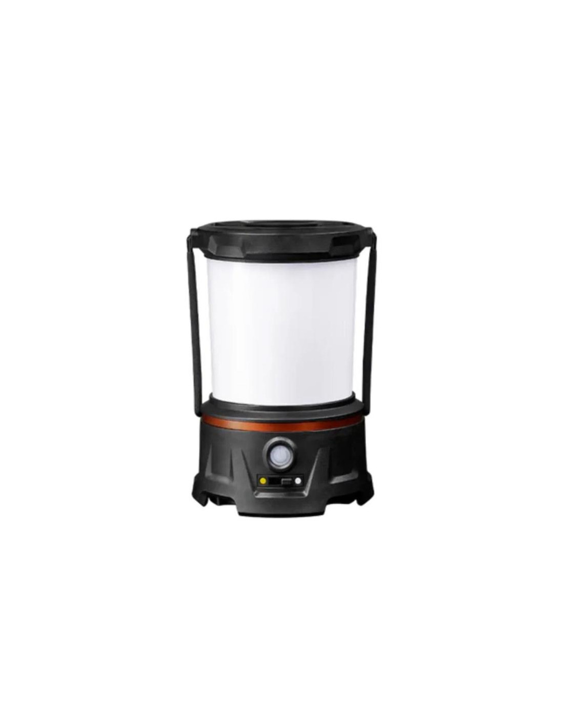 Su carcasa de polímero reforzado es resistente a los golpes, el polvo y la lluvia. Además, pesa lo justo para colgarla dentro de la tienda y se mantiene firme sobre la mesa cuando sopla el viento. Aunque si lo prefieres, también puedes llevarla como un farol clásico gracias a su asa plegable.
