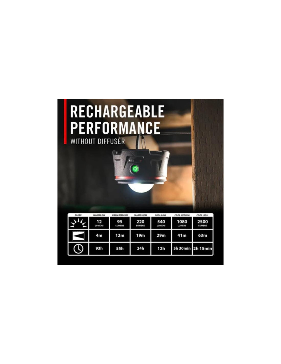• 8 modos de luz cálida, fría y roja con distintos niveles de intensidad (warm low, warm medium, warm high, cool low, cool medium, cool high, red y red flashing)