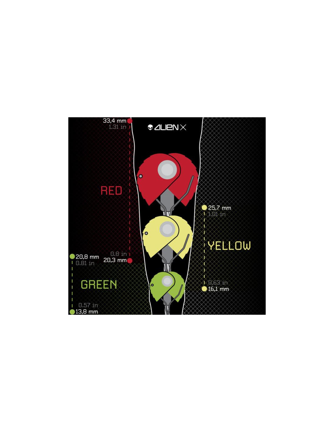 - Alien Rojo: Rango de expansión de 20,3 a 33,4 mm (0,80 a 1,31 in).