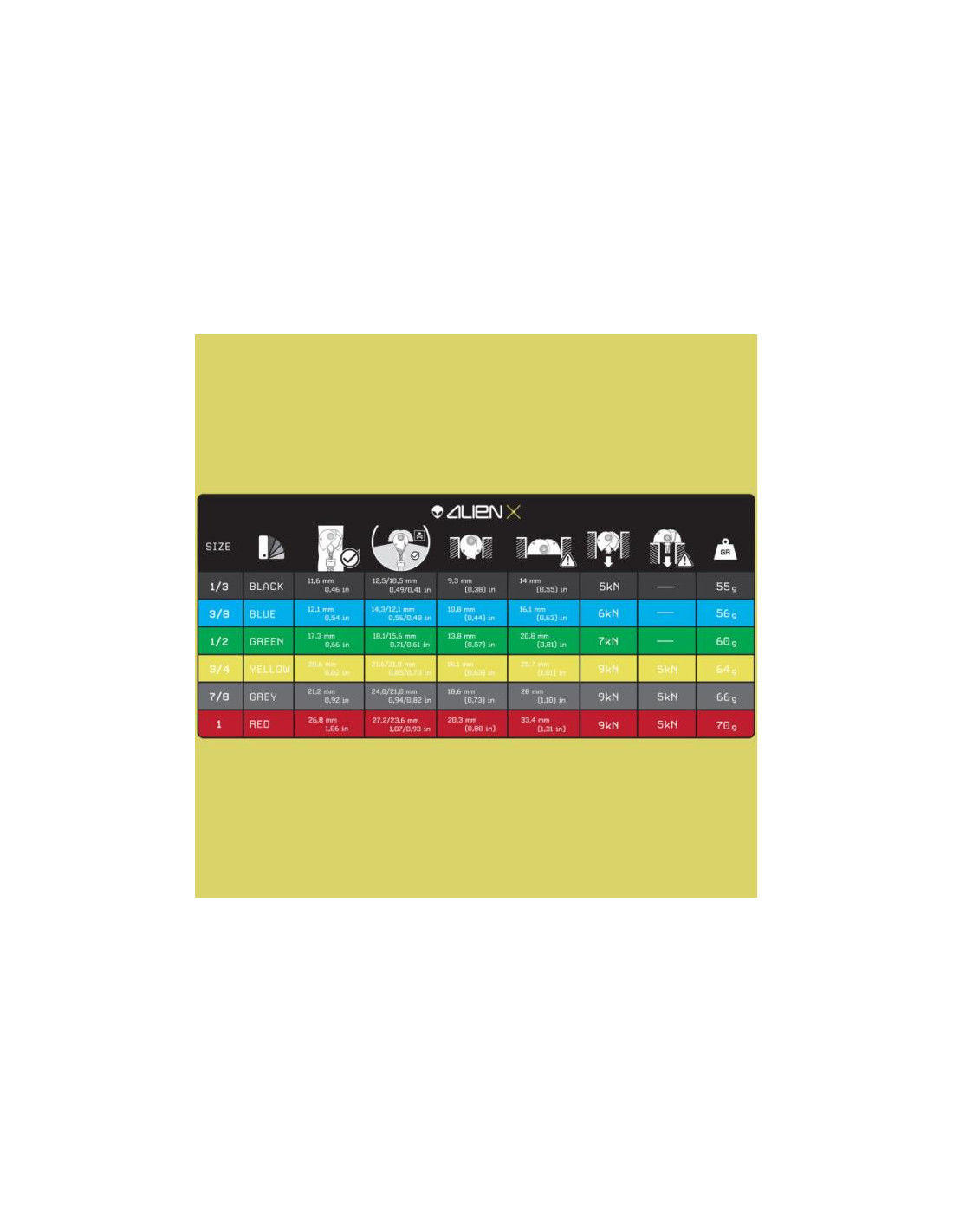 - Alien Amarillo: Rango de expansión de 16,1 a 25,7 mm (0,63 a 1,01 in).