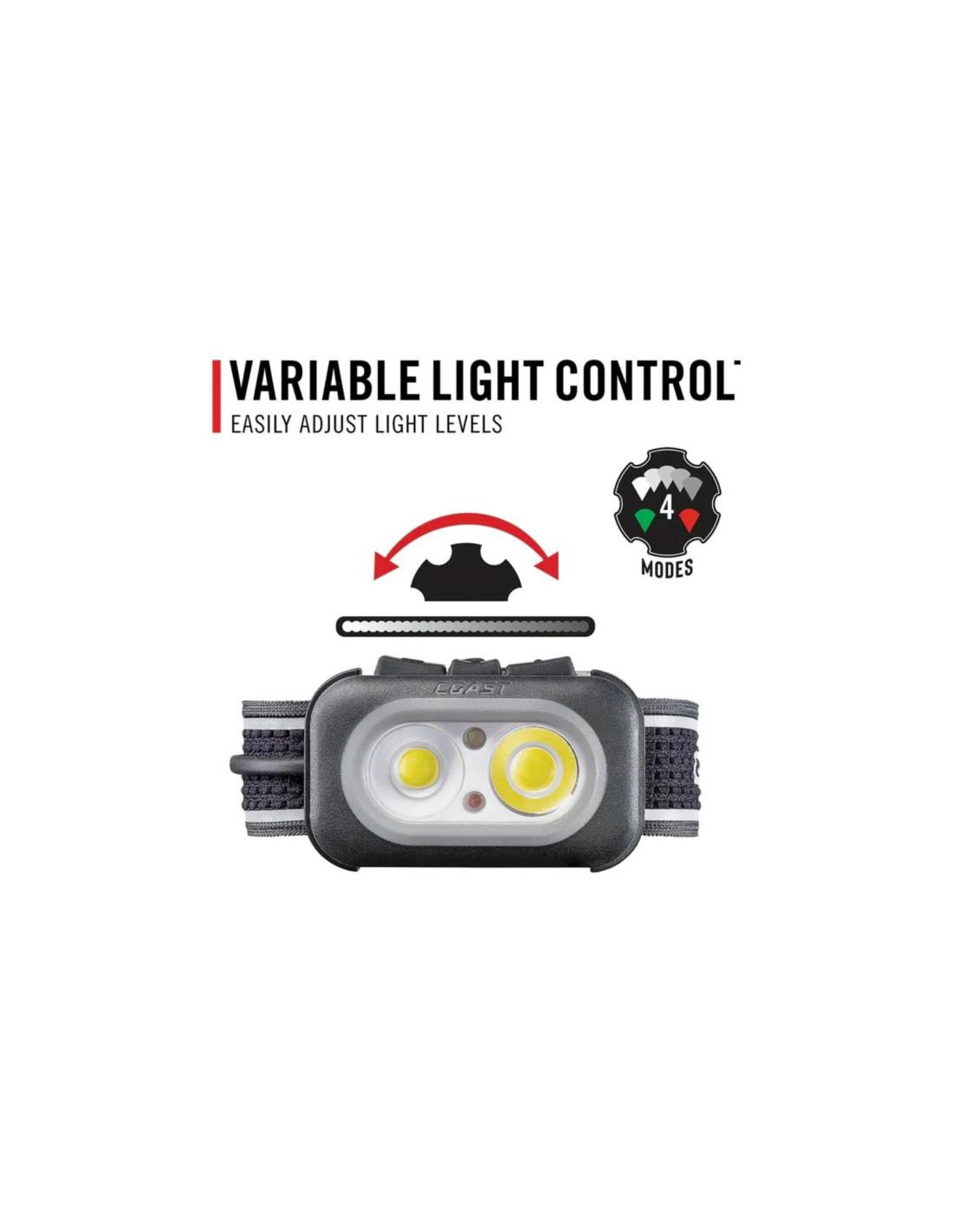 Gracias a su tecnología COAST Variable Light Control puedes regular fácilmente el nivel de luz según lo que necesites y, además, combina un haz blanco tipo “chip on board” para uso general y LEDs rojo/verde antirreflejo que protegen tu visión nocturna.