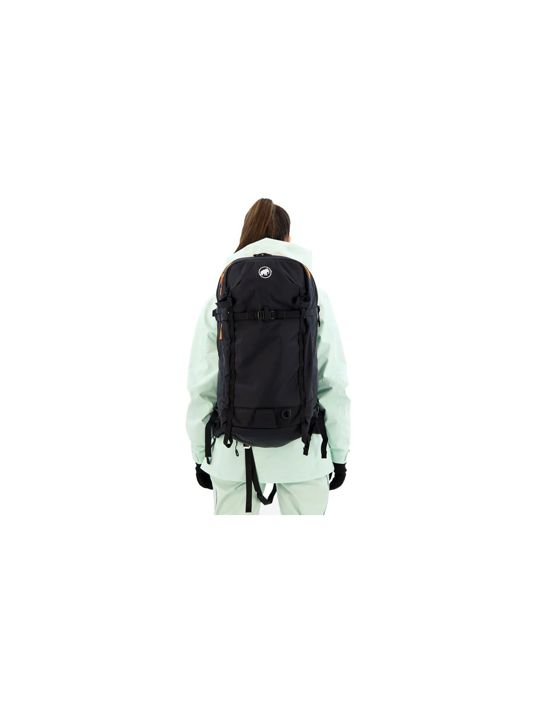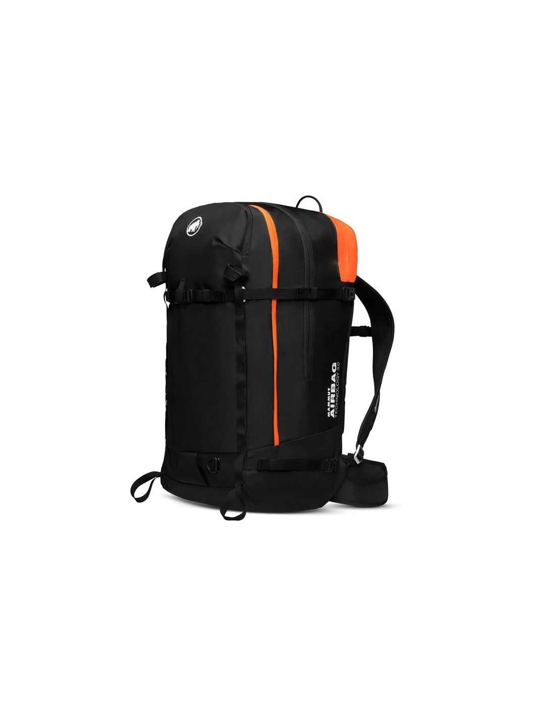 El acceso al compartimento principal es versátil, pudiendo realizarse tanto por la parte superior como a través de una cremallera completa en la espalda, lo que permite un acceso rápido a todo el equipo. Dispone de un compartimento específico de color naranja para el material de seguridad contra avalanchas.