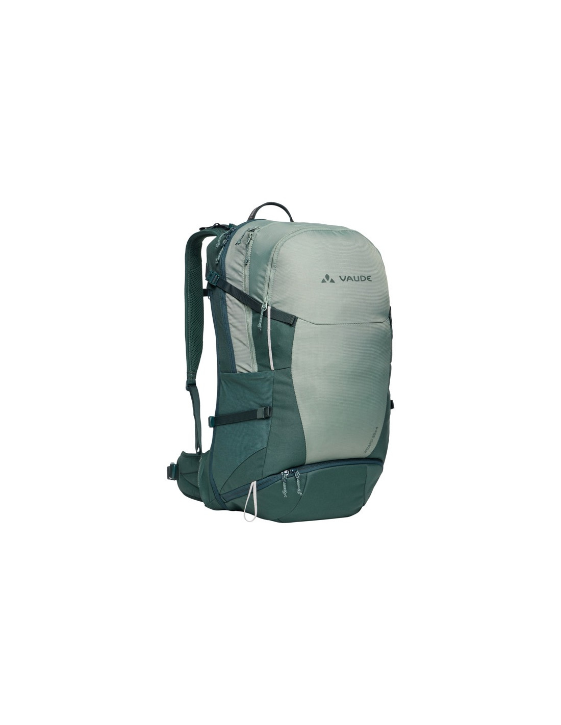 - Correas de fijación exteriores para bastones de trekking.