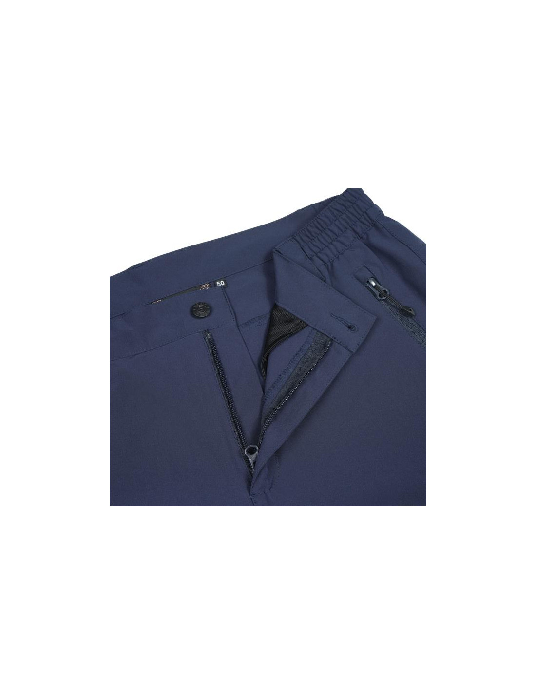 El tejido tiene un tratamiento repelente al agua, gracias al cual el pantalón no se moja con las salpicaduras o la lluvia ligera. Añaden trabillas, cierre de cremallera, bolsillos delanteros con cremallera y un bolsillo trasero. En los bajos cuentan con cordones de ajuste que se pueden usar para ajustar el pantalón contra la caña de la bota.