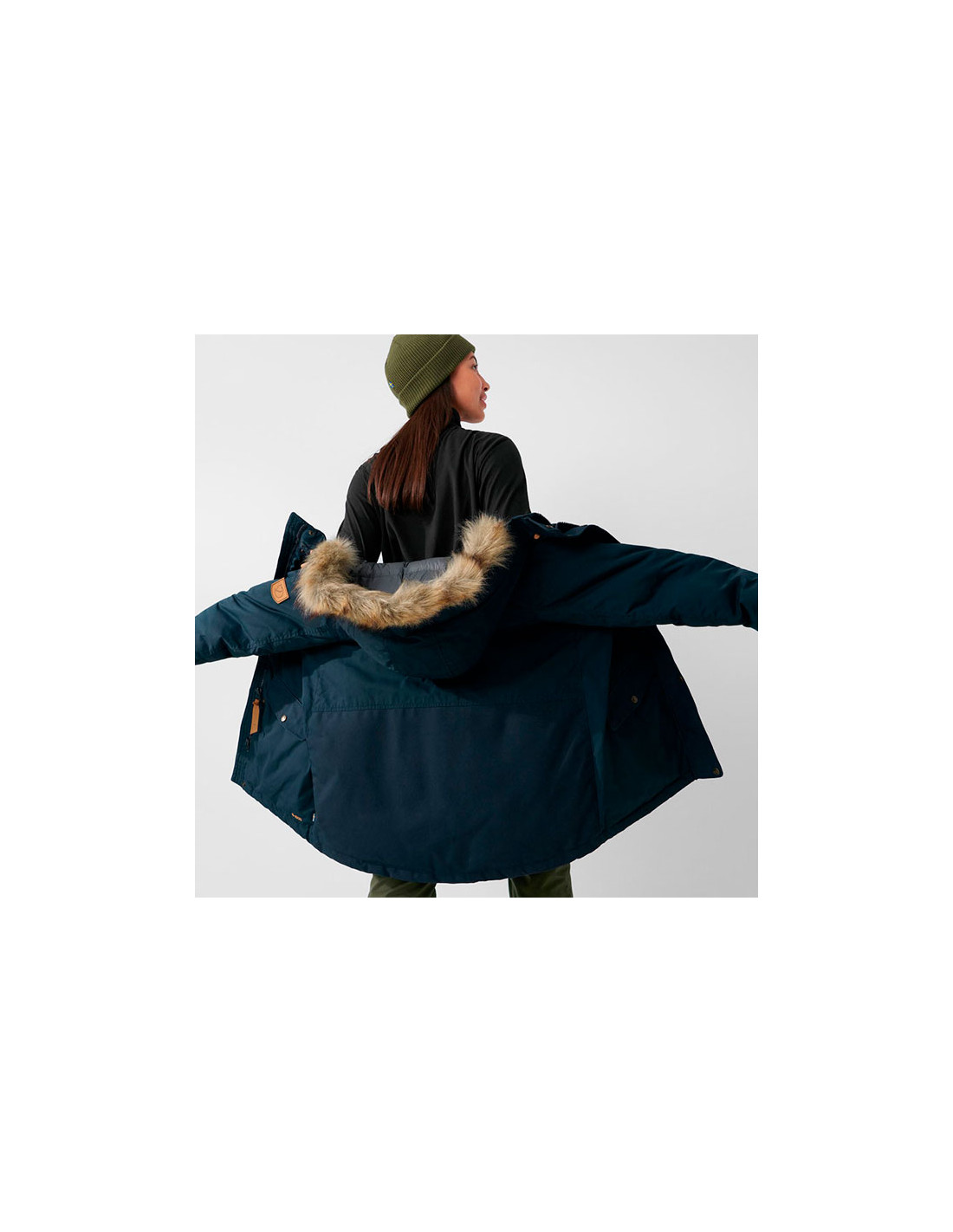 - Säädettävä huppu irrotettavalla synteettisellä turkiskoristeella.