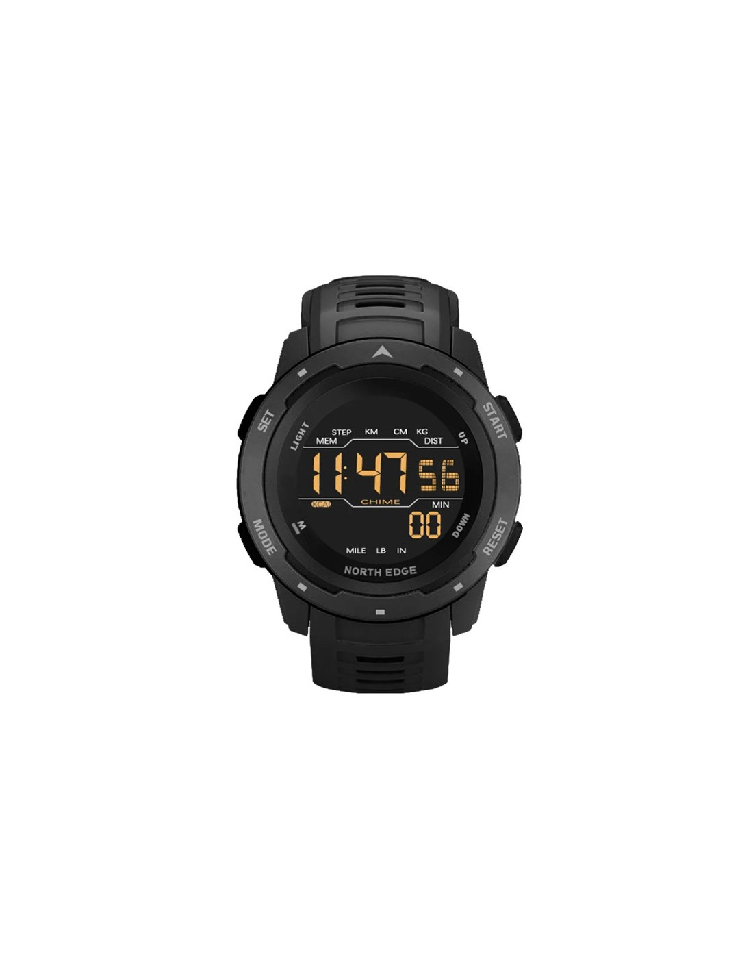 Vedenkestävä urheilukello (50 m), jossa on 12-numeroinen näyttö, joka näyttää tunnit, minuutit, sekunnit, askellaskurin ja askelmaaliprosentin. Näytä päivämäärä napin painalluksella.