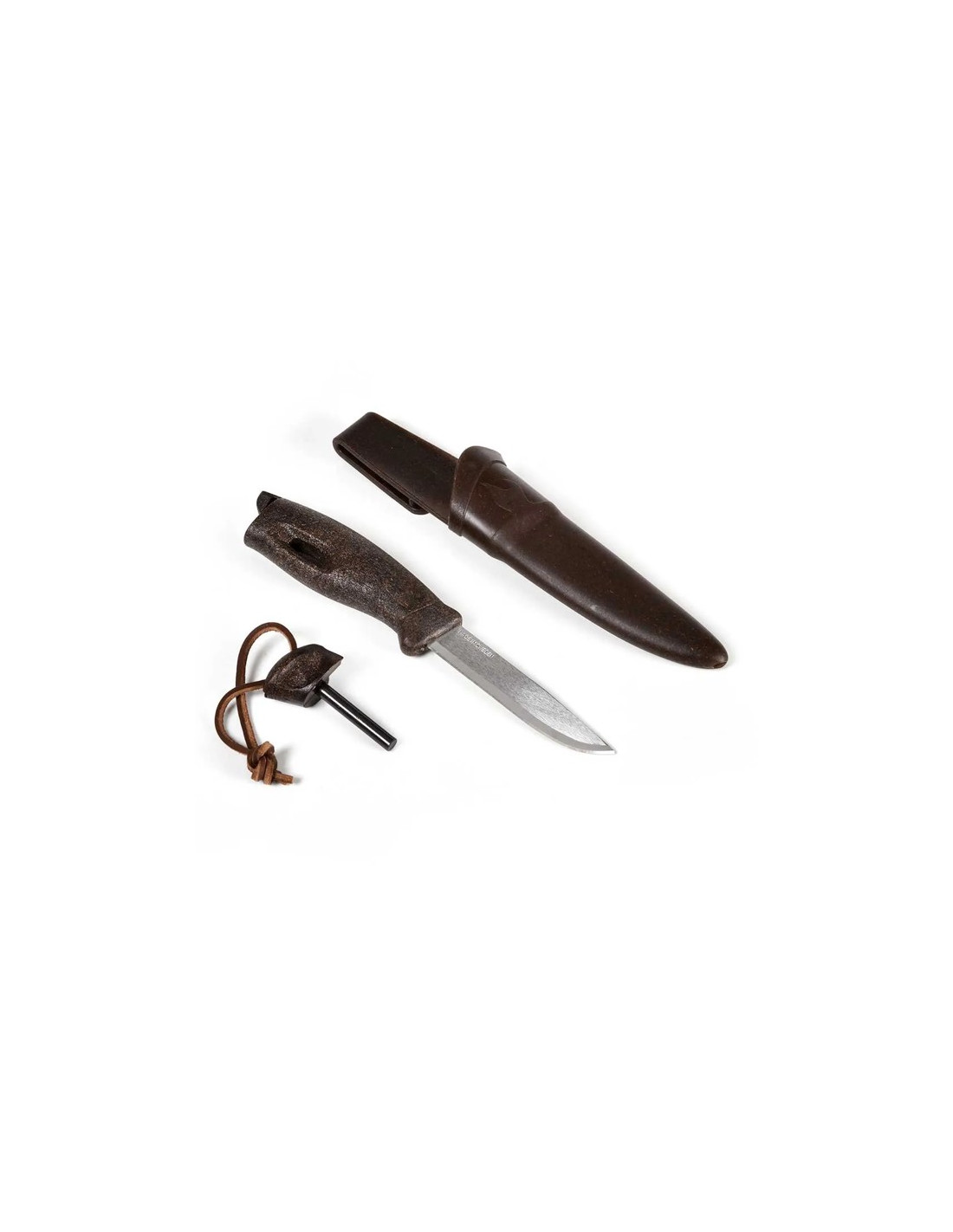 Siinä on säänkestävä ruotsalainen piikivi, jonka kesto on jopa 3000 käyttökertaa ja joka pystyy synnyttämään kipinöitä 3000 °C:ssa. Tämän FireSteelin avulla voit helposti sytyttää tulipaloja missä tahansa tilanteessa, jopa sateessa tai tuulessa. Tuppi, joka on myös valmistettu biomuovista kookospähkinän kuorikuiduilla, sopii täydellisesti veitseen ja siinä on vyöpidike ja tyhjennysreikä.