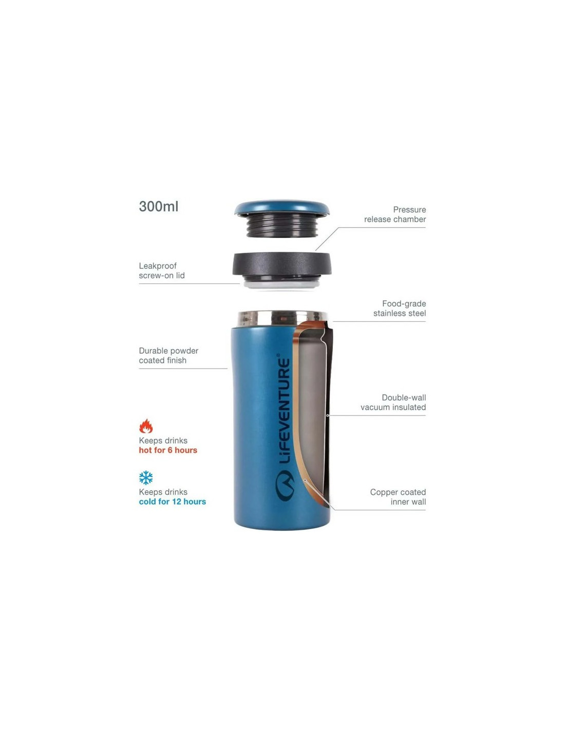 Elintarvikelaatuisesta 18/8 ruostumattomasta teräksestä valmistetussa kaksiseinäisessä mukissa on turvallinen kierrekansi roiskeiden estämiseksi. Lisäksi se on BPA-vapaa terveellisen juomakokemuksen takaamiseksi. Säilyvyyden pidentämiseksi on suositeltavaa pestä se käsin.