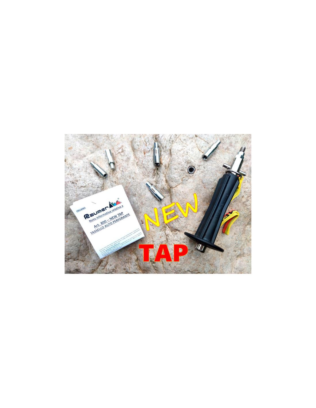 Raumerin itselävistävä ankkuri. Tämän tyyppisen ankkurin etuna on, että sinun ei tarvitse käyttää poraa reiän tekemiseen, se voidaan tehdä manuaalisesti hakkurin avulla. Hampaat ovat erittäin vahvat, joten sinun ei tarvitse käyttää toista TAP:ta reiän täyttämiseen. Varoitus: Lujuusarvot voivat muuttua merkittävästi riippuen harkittavasta kivityypistä ja väärästä asennuksesta. Käytä aina TAP-runkoa Raumer Srl:n toimittaman kartion kanssa. Käyttö muun tyyppisten kartioiden kanssa, joiden mitat voivat olla väärät, voi vaarantaa ankkurin tiiviyden. Raumer Srl ei ota vastuuta TAP-ankkurin käytöstä, erityisesti virheellisen asennuksen sattuessa. Ominaisuudet: