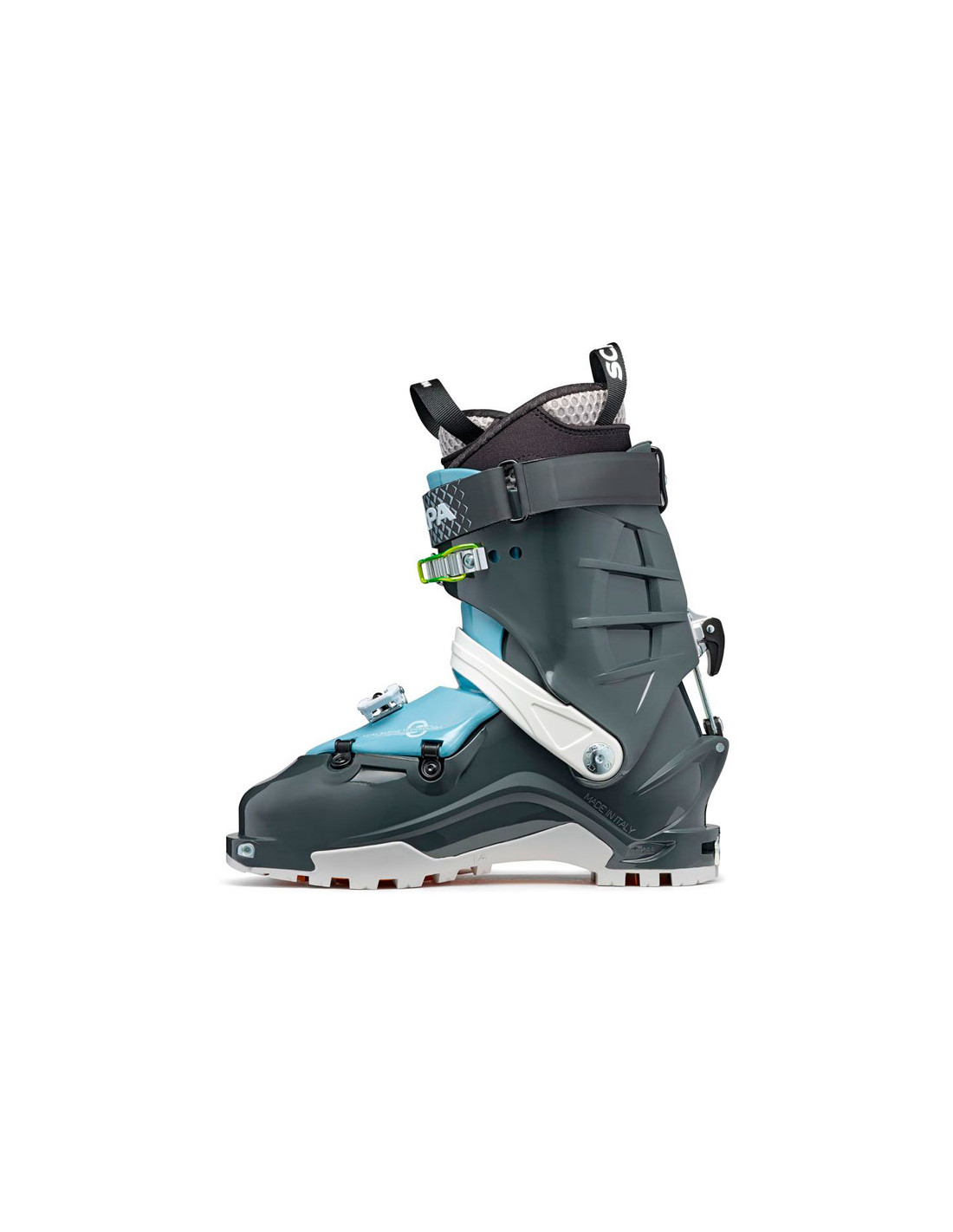 Siihtokengät Scarpa-merkiltä, uusi malli, joka on valmistettu Pebax® Uusi. Termoplastiset elastomeerit, joissa käytetään uudelleen uusiutuvia luonnonvaroja, jotka eivät vaaranna Pebax®:n tunnettuja ominaisuuksia, keveyttä, elastisuuden palautusta ja iskunkestävyyttä.