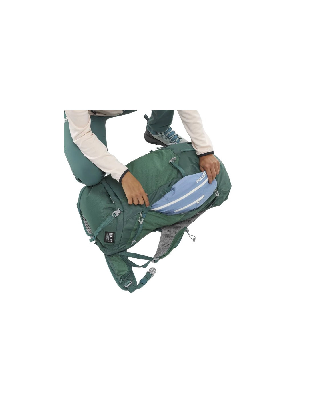 - Useita taskuja: 1 verkko edessä, 2 verkkosivua, 2 vetoketjulla läpässä ja 2 vyöllä.