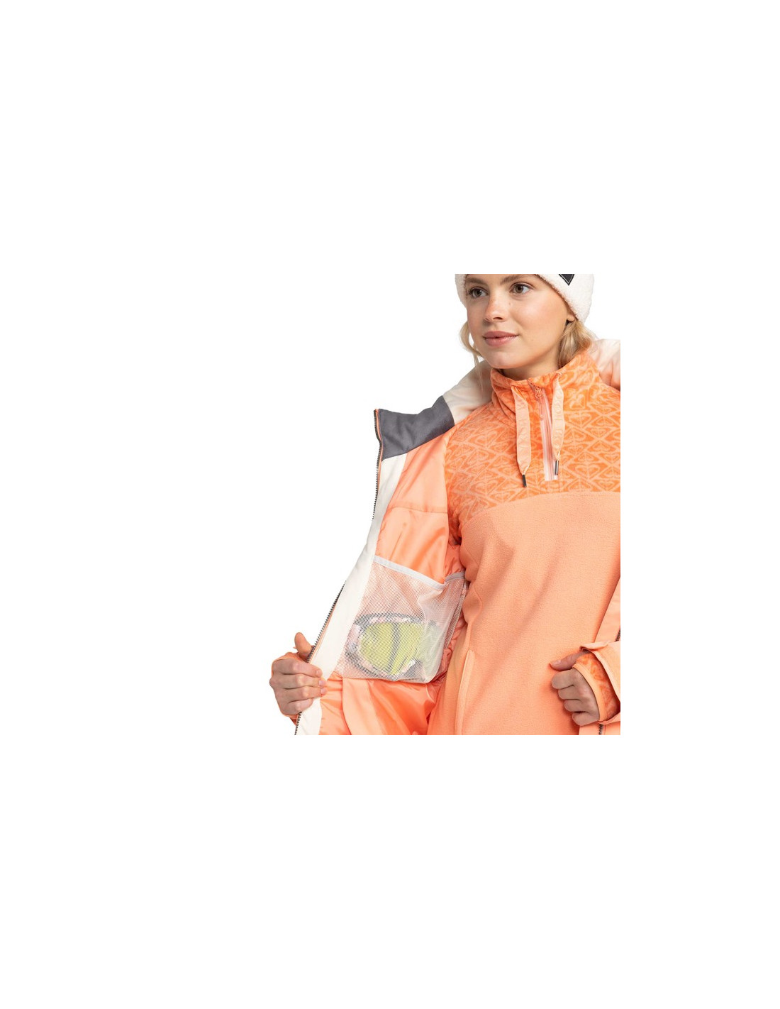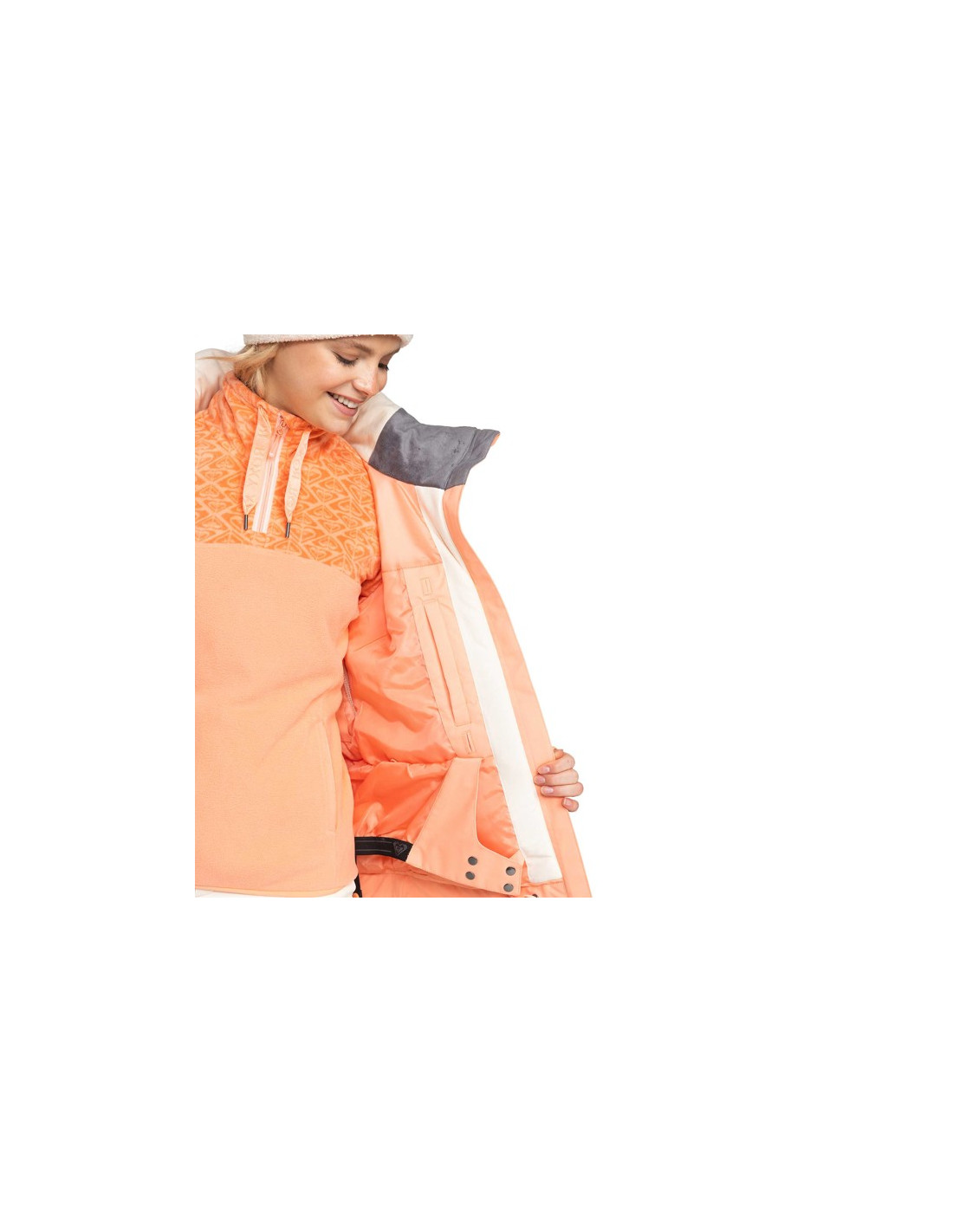 Kevyt taftivuori ja Roxy Warmflight -eristys tarjoavat lämpöä kylmissä olosuhteissa. Irrotettava ja säädettävä huppu, lumihame ja takki-housujen liitosjärjestelmä lisäävät vaatteeseen toimivuutta.