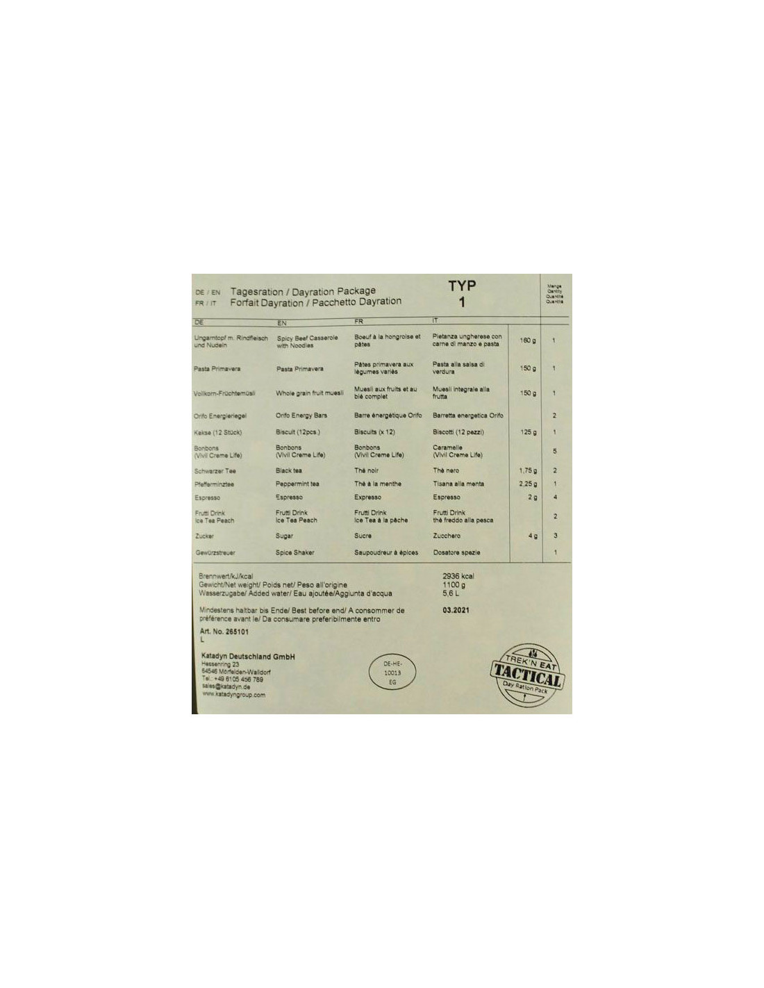Päivittäinen annos (paketti 1) on henkilökohtainen ruokapaketti yhdelle päiväksi. Se varmistaa, että sotilailla on tarpeeksi syötävää, vaikka ruokaa ei saada kenttäkeittiön tai ruokasalin kautta. Pakettien pohja koostuu Trek'n Eat-pakastekuivatuista aterioistamme. Pakastekuivaus poistaa kaiken kosteuden Trek'n Eat-ruoista tuhoamatta tärkeitä vitamiineja ja kivennäisaineita.