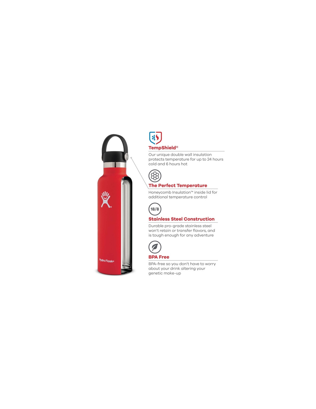 La bouche standard de 24 oz présente une construction en acier inoxydable à double paroi pour une meilleure isolation thermique.