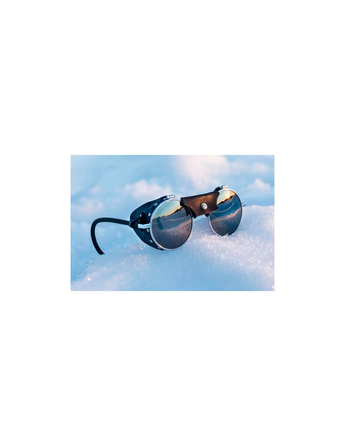 Paire de lunettes au style rétro. Elle rappelle les lunettes de l'alpinisme classique des années 1970. La marque Julbo propose ce modèle pour retrouver les origines de l'alpinismes avec les technologies actuelles.