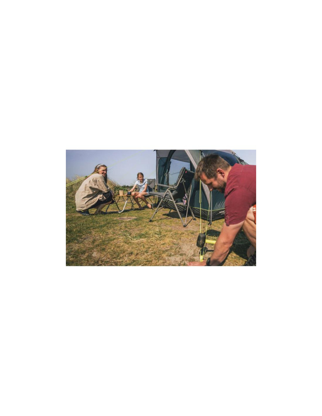 - Type : Tente tunnel à trois pièces.