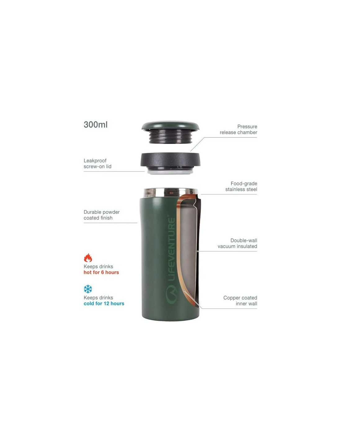 Az élelmiszeripari minőségű 18/8 rozsdamentes acélból készült duplafalú bögre biztonságos csavaros fedéllel rendelkezik, hogy megakadályozza a kiömlést. Ráadásul BPA-mentes az egészséges ivási élmény érdekében.