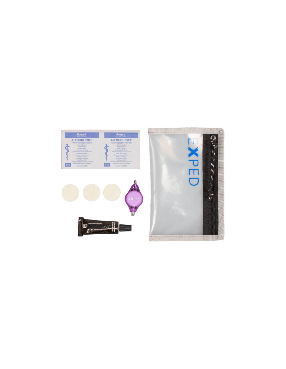 Exped szőnyegjavító készlet. Tartalmaz alkoholos törlőkendőt, tapaszt, UV-szárító ragasztót és UV kulcstartót. Ideális gyors javításokhoz bárhol.