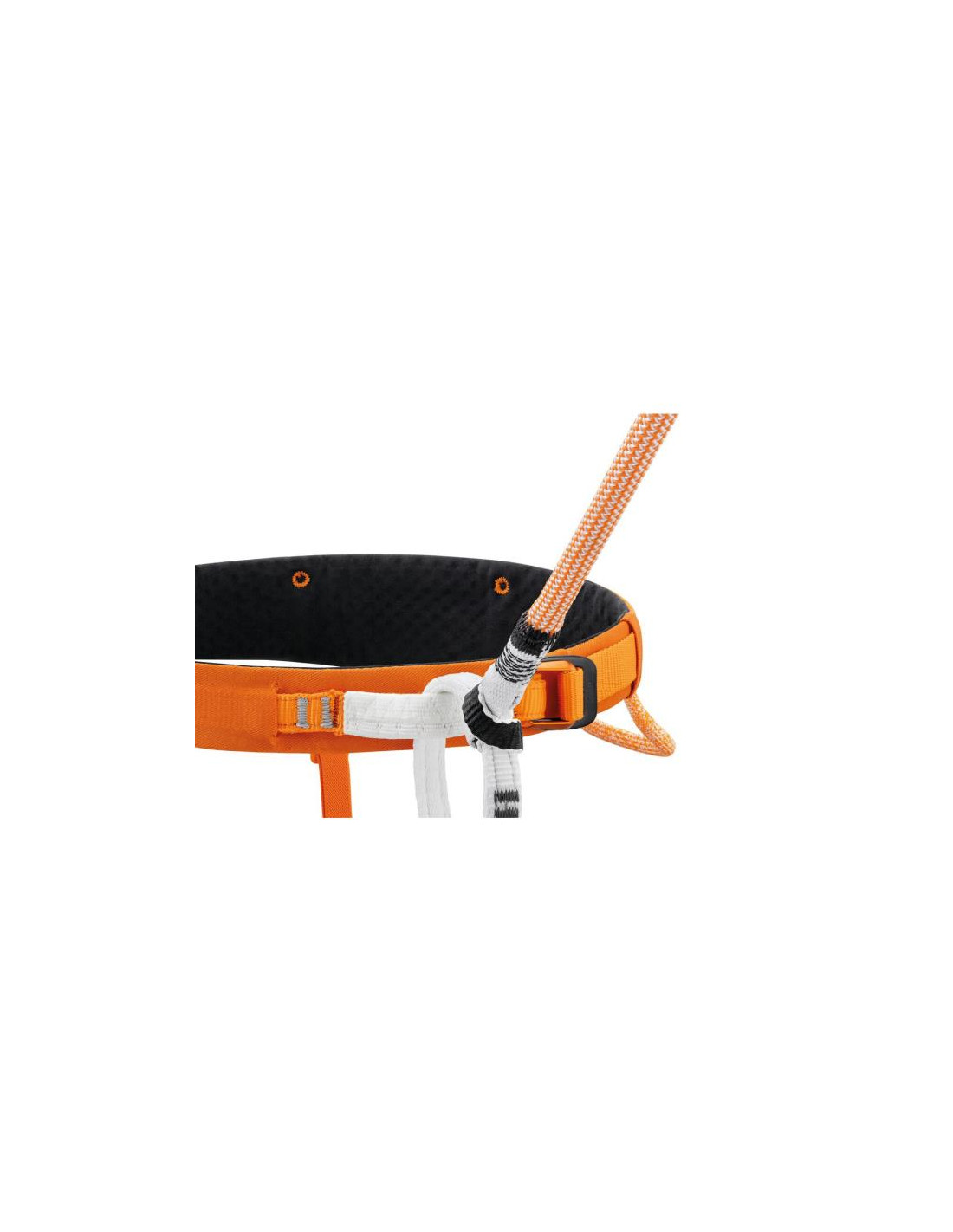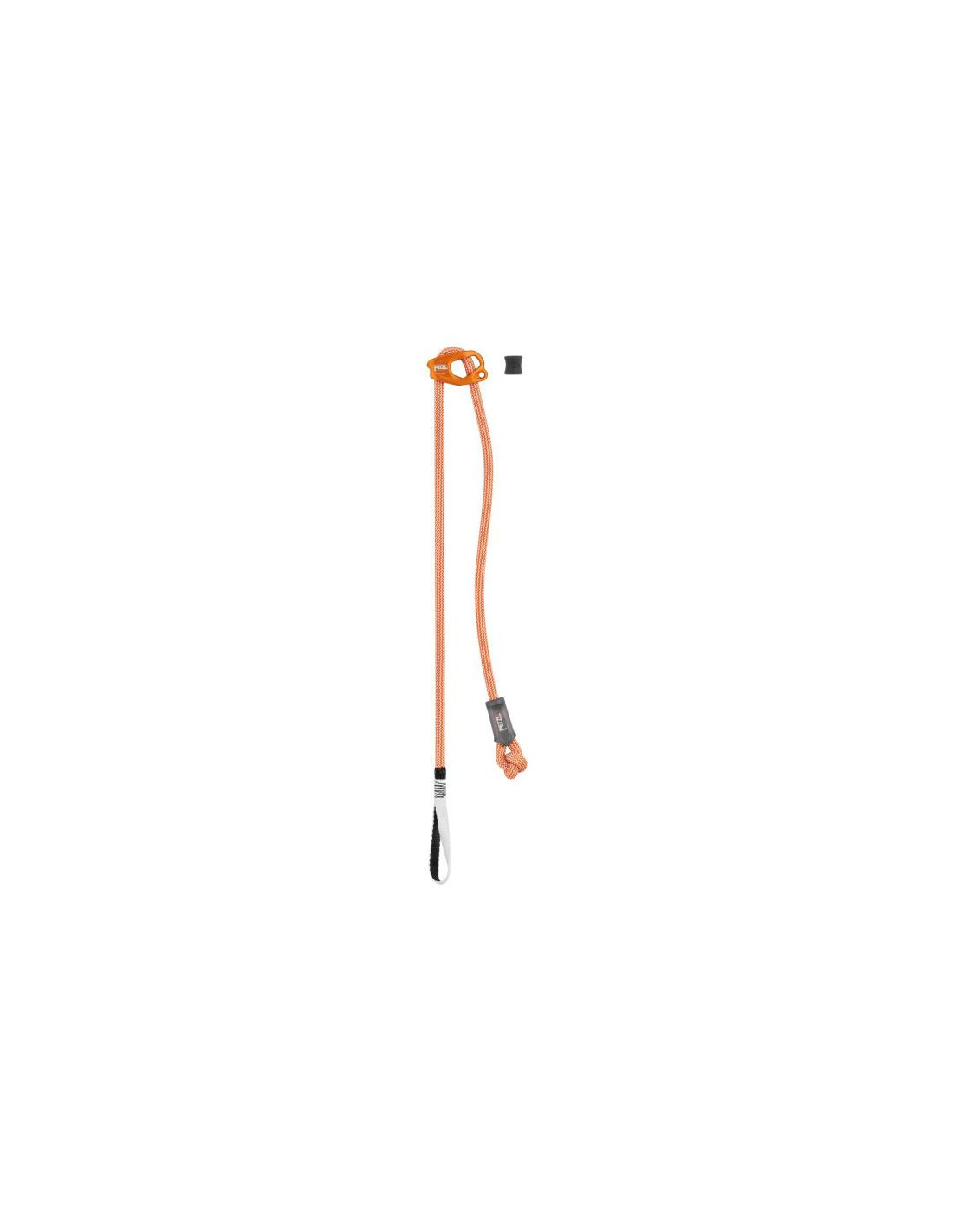 - Anello di collegamento in nastro di polietilene ad alta densità (HDPE) cucito (brevetto Petzl) che permette di installare il cordino sull'imbracatura per mezzo di un nodo allodola compatto, limitando così il volume nell'anello di assicurazione e fornendo una migliore visibilità durante la manipolazione in sosta.