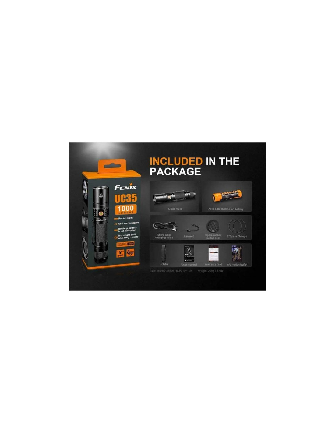 - Include: torcia UC35V2, batteria 18650, cavo Micro-USB, cinturino, pulsante di ricambio, 2 o-ring, custodia, manuale e garanzia.