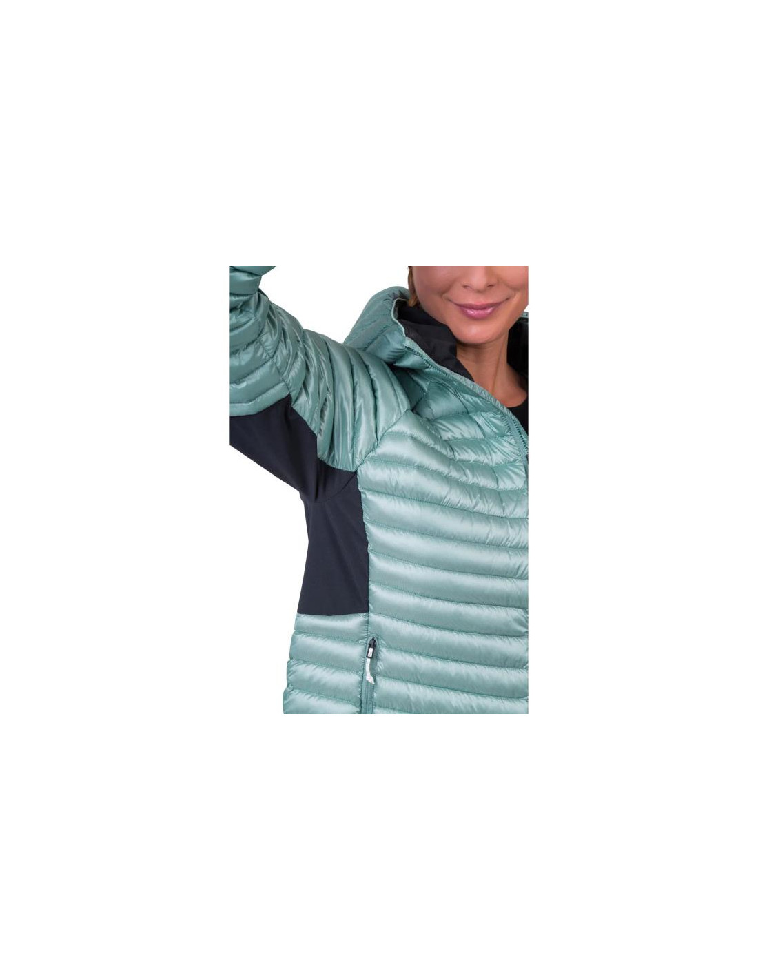 Lengva pūkinė striukė moterims su vandeniui atspariu apdorojimu. Tamprios pažastų plokštės leidžia nevaržomai judėti ir suteikia komforto. Deflektorinės konstrukcijos užpildymo technologijoje naudojami aukštos kokybės ančių pūkai santykiu 80/20, kurių užpildymo galia yra 750 kuinų. Ančių pūkai yra iš sertifikuotų ūkių ir yra apdorojami laikantis aplinkosaugos standartų. Striukė suteikia puikų šiluminį komfortą ir užtikrina mažą svorį bei lengvą supakavimą į pridedamą daiktų krepšį.