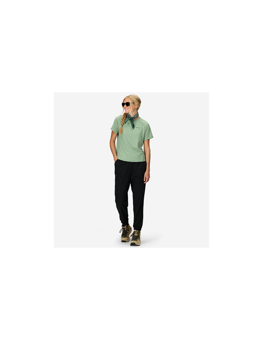Marmot AirExchange SolarShield Jogger kelnės moterims idealiai tinka žygiams ir žygiams pėsčiomis. Jis sujungia "AirExchange" audinio pralaidumą orui ir greitą džiūvimą su UPF 50 apsauga nuo saulės. Elastinga juosmens juosta su vidiniu raišteliu puikiai priglunda.