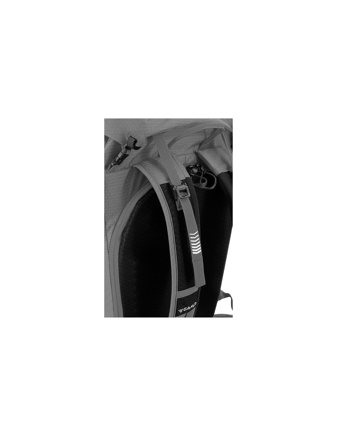 - Paslėpta slidžių laikiklis su apverčiamais dirželiais papildomai įrangai pritvirtinti prie kuprinės priekio (pvz., kilimėlio ar snieglentės).