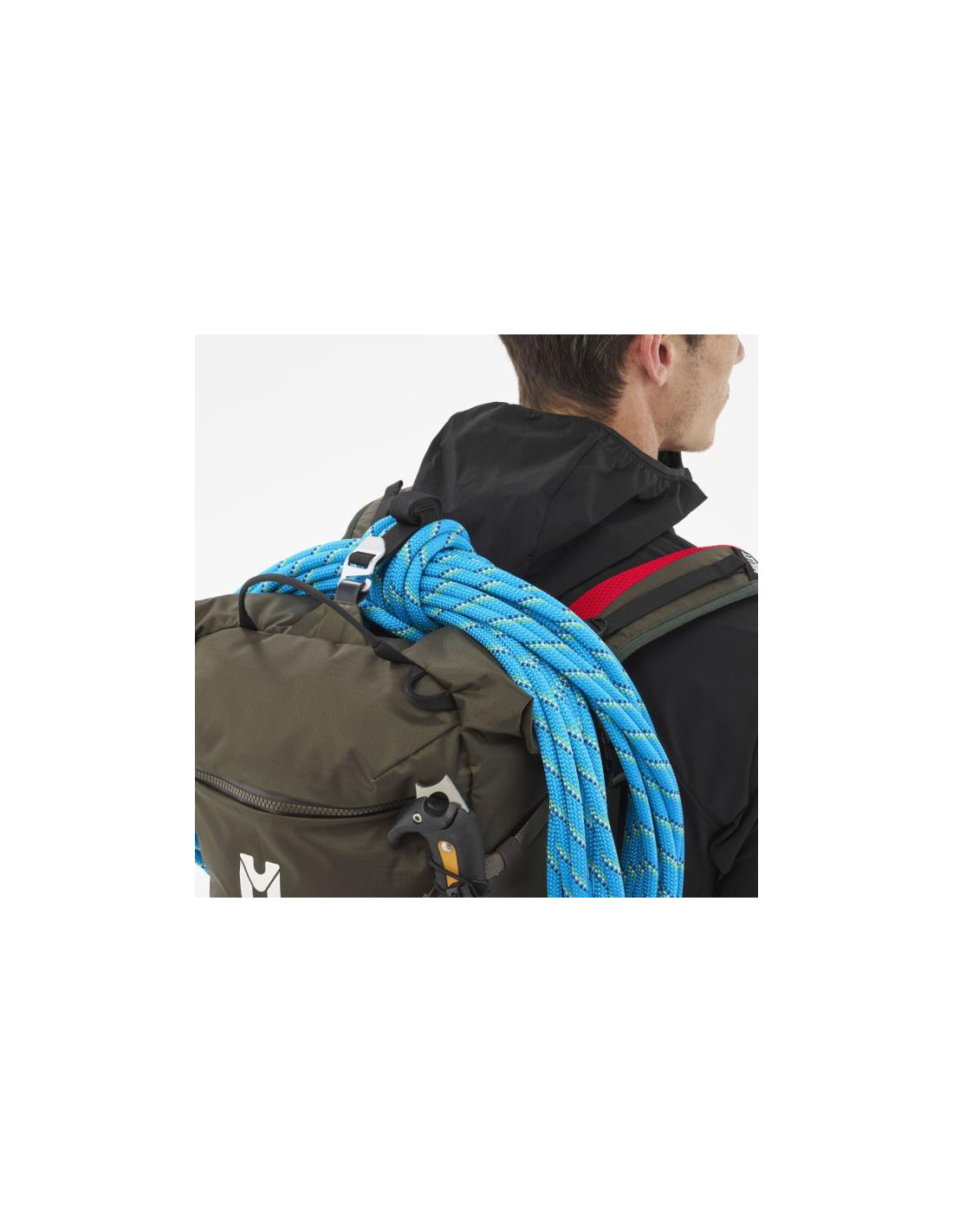 Prieš pradėdami kilti, ištraukiame apsauginę striukę per šoninę angą užtrauktukas ir dribsnių batonėlis iš priekinės kišenės. Vertinamas šios alpinizmo kuprinės funkcionalumas, kuris netgi leidžia integruoti drėkinimo maišelį. Su išvyniota anga ir dviem viršutinėmis rankenomis greitai ir lengvai pasiekiame jos turinį.