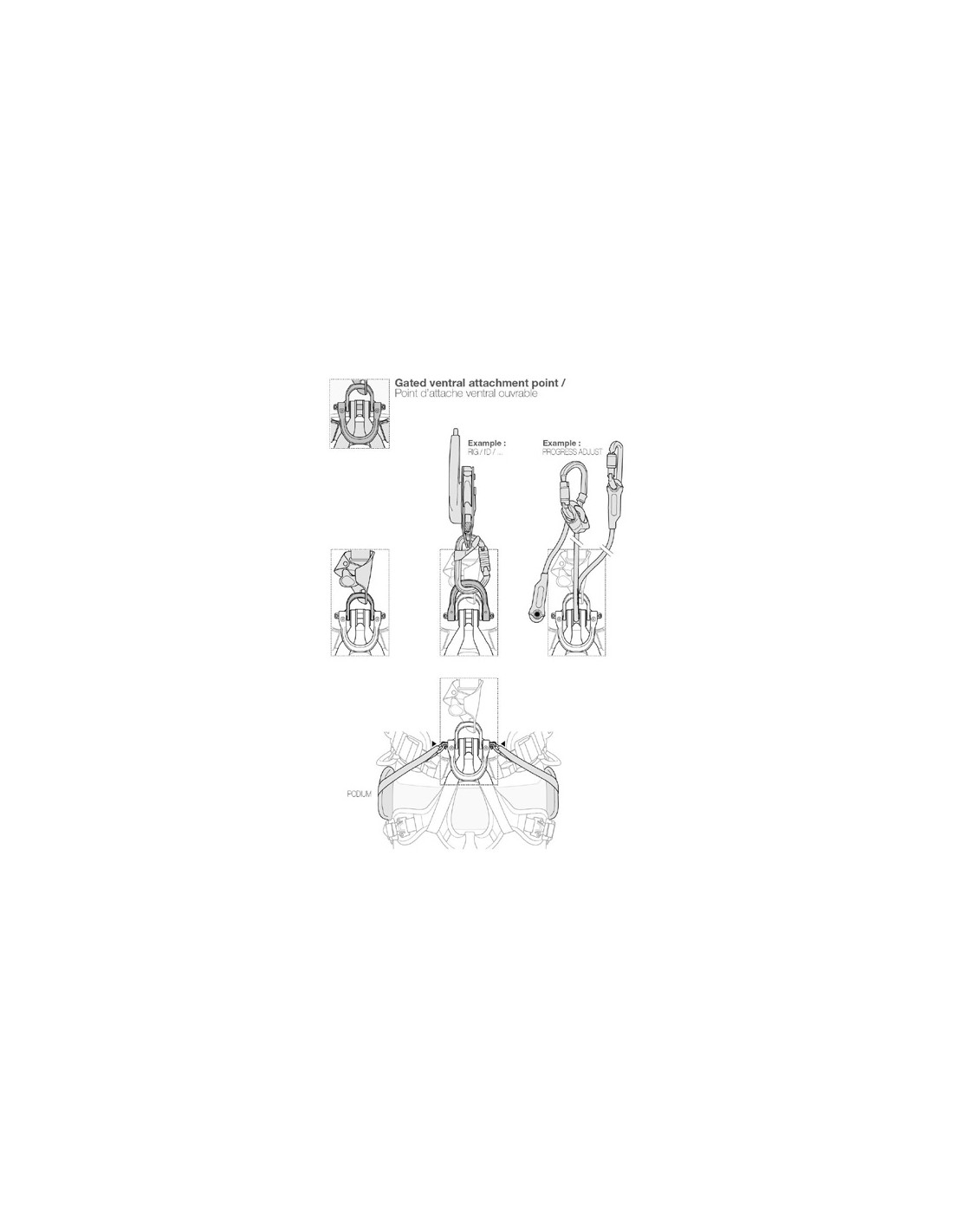 - Podium sėdynės sujungimas su ašimi naudojant du apkabas (tiekiami atskirai nuo diržų ir podiumo), leidžianti tiesiogiai valdyti nusileidimą, tuo pačiu garantuojant pilvo tvirtinimo taško mobilumą.