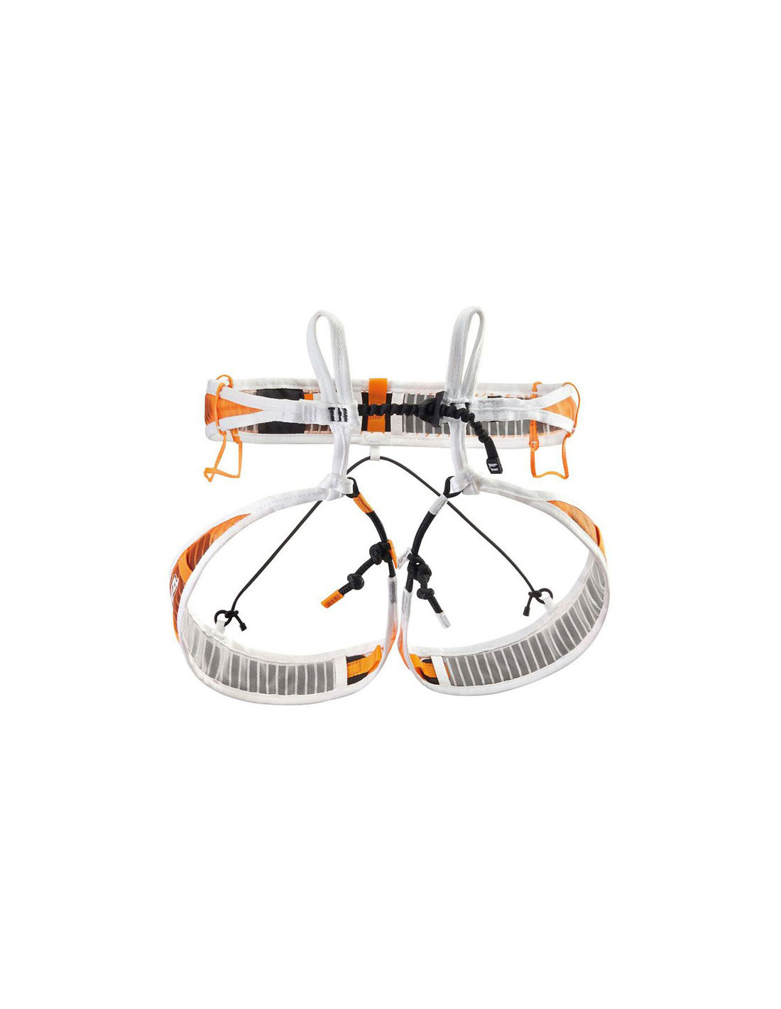 - Inovatyvi konstrukcija be sagčių (Petzl patentas). Stumdomas stabdys pakeičia metalinę sagtį, kad būtų galima greitai ir lengvai reguliuoti diržą. Kojos sureguliuotos lervos mazgu.