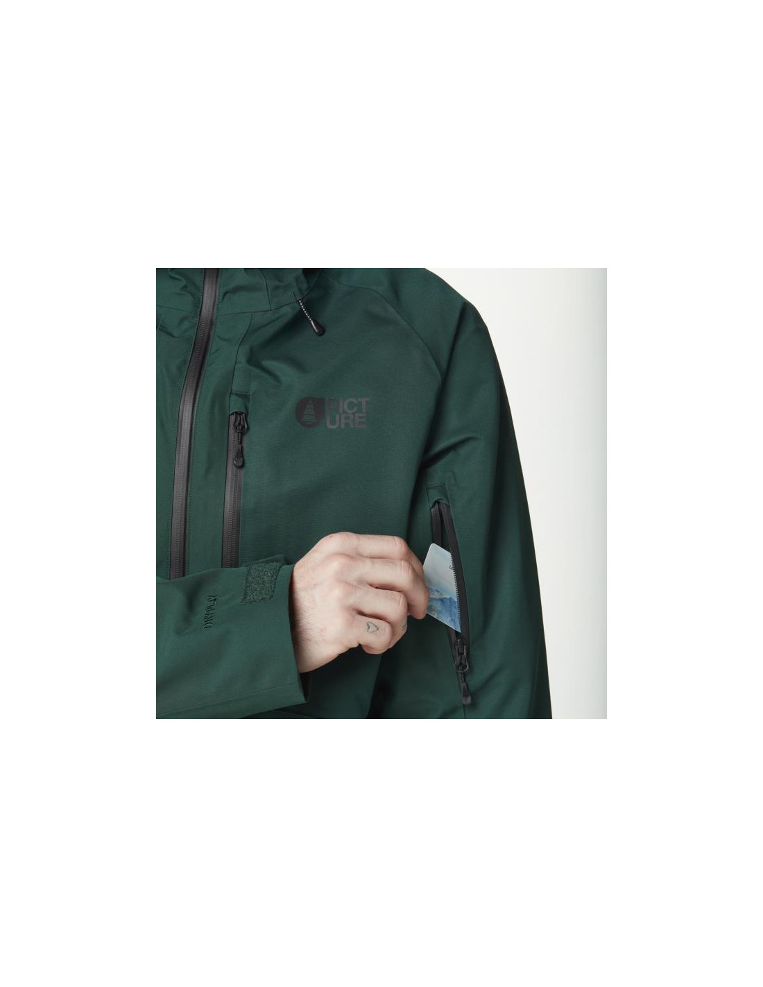 - Krūtinės kišenės su vandeniui atspariais užtrauktukais.